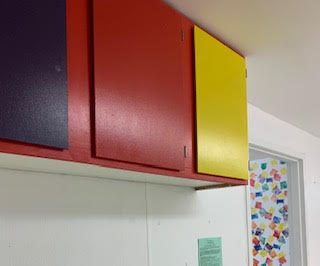 The CMU block, drywall, and trim were not uniform in coverage or color and the cove base molding was worn. The existing colors were very bright and there were multi-colored cabinets fronts, man doors, and areas of “sponged” stenciling on the walls, all which needed prep and to be primed and painted one color. Four new wall colors were required for each wall in the mini gym and the unpainted wooden stair railing leading to the second level 2nd of the gym needed painted to match the rest of the railing in the gym.