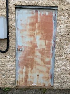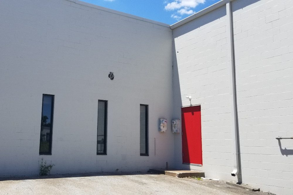The building was first pressure washed to remove debris, peeling paint, dark spots, and to prepare block surfaces for coating. It took the crew several days to remove all black spots from the split brick. After pressure washing the CMU block, there were still areas of peeling paint and more exposed bare areas. These peeling areas were scraped to a sound substrate, bare areas were primed using an elastomeric masonry primer, then all CMU block was top coated with two coats of an exterior acrylic latex coating by Sherwin Williams. The man doors, bollards and metal railings were scraped, sanded, and primed as necessary with a metal primer, then top coated with two coats of SW Pro Industrial Urethane Alkyd Enamel. To reach the top of the building, we used a 60-foot lift and ladder.