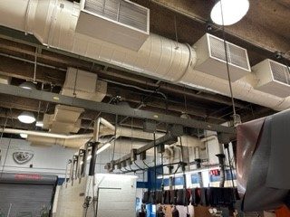 Our scope of work included tasks such as cleaning and preparing the ceilings, walls, doors, trim, and the removal of cove base, followed by the application of a fresh two-tone color scheme. Additionally, we were tasked with adding a distinctive blue line stripe, extending two cinder blocks high, around the perimeter of both welding rooms. To ensure a polished finish, we also cleaned and color-matched the heavily used individual welding stalls before applying a uniform coat of flat gray paint.