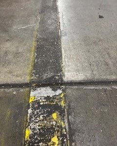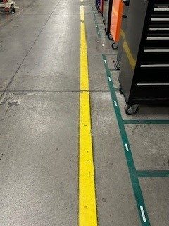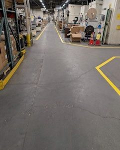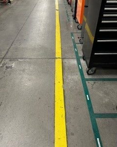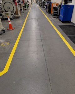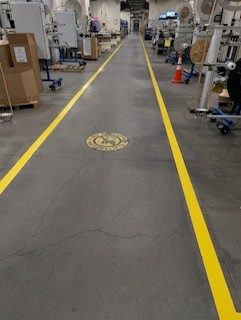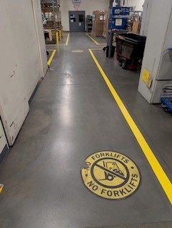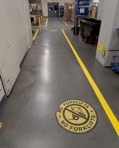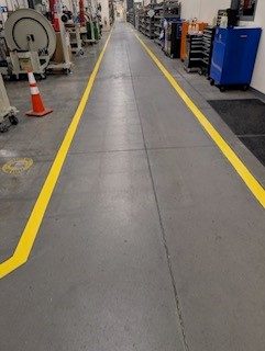 This project at the Tooling Dynamics Plant involved refurbishing 2,850 linear feet of 4-inch pedestrian walkways. The work included thorough surface preparation: scraping away the old floor coating, cleaning the concrete, and meticulously measuring and taping for the new lines. Sherwin Williams Macropoxy 646 Fast Cure Epoxy was chosen for the repainting. Adding to the complexity, some areas had severely worn markings, making the original lines nearly invisible. Furthermore, the crew had to maneuver around immovable equipment, often working in very close quarters.