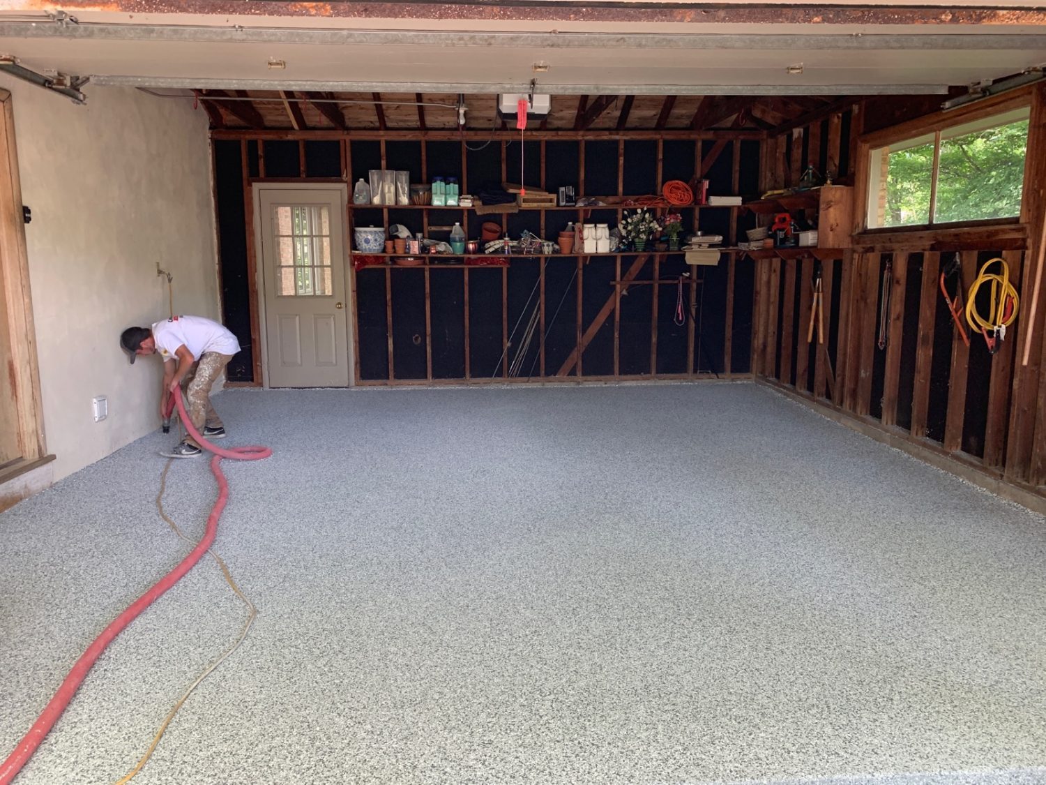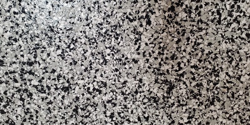 After floor prep, which include using a grinder on the floor and cleaning of the surface, a tinted base coat is applied on top of the concrete. Before the base coat dries, a layer of decorative chips are evenly spread across the surface and left to set for a few hours. Once dry, any excess chips are scraped off the surface and cleaned.