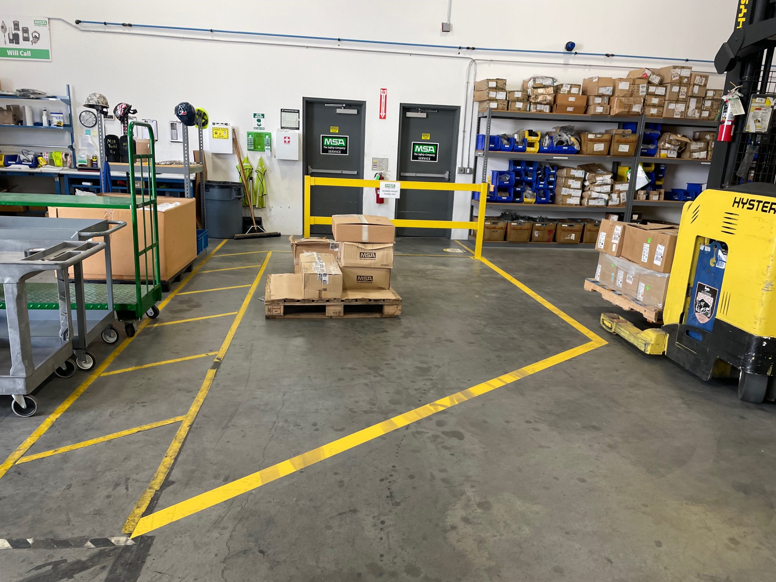 We cleaned the surfaces by pressure washing when outdoors and by hand washing inside the warehouse to minimize water usage and runoff. A clean surface promotes adhesion of the coating to the substrate.
