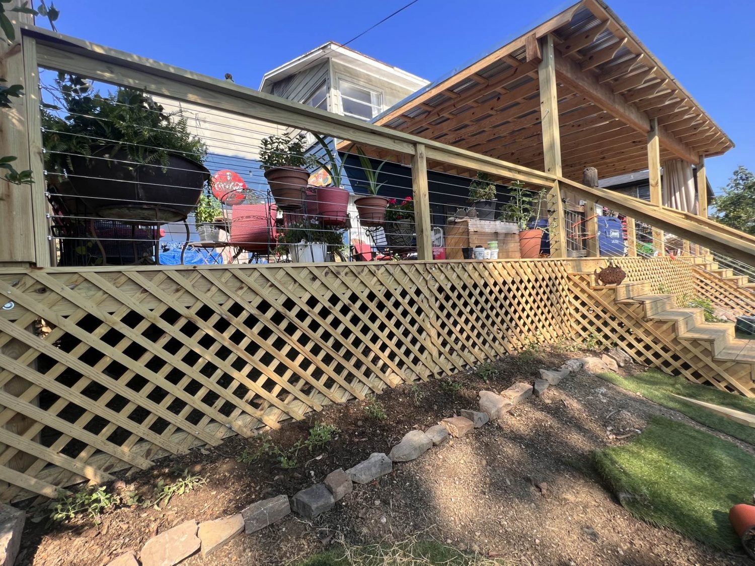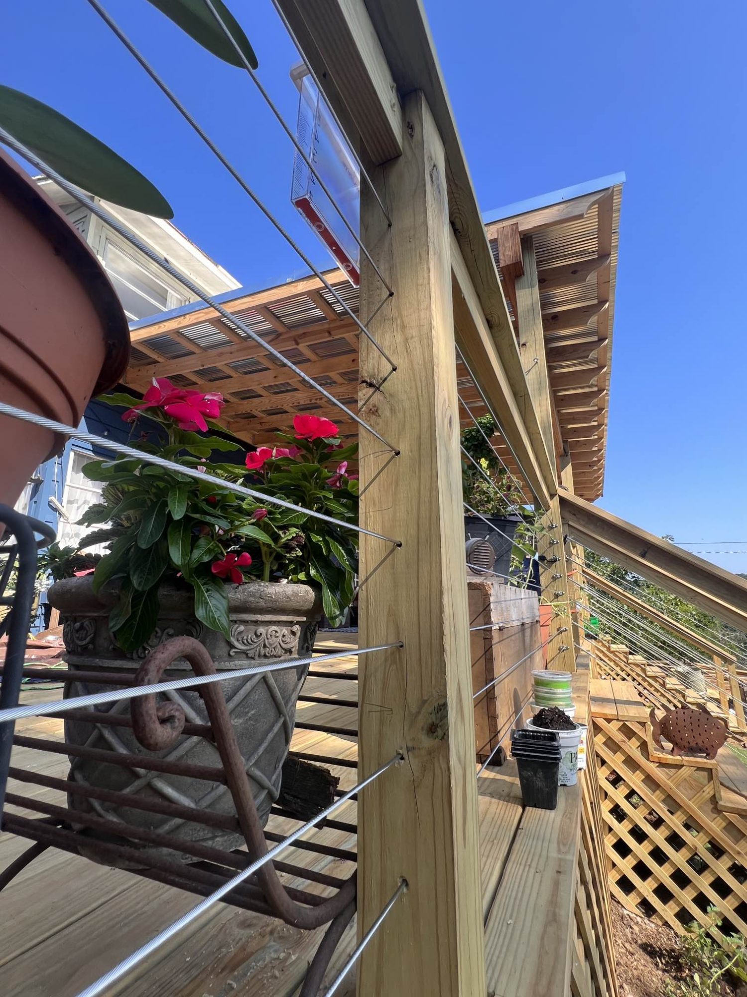 The deck fence used horizontal metal wires instead of spindles.