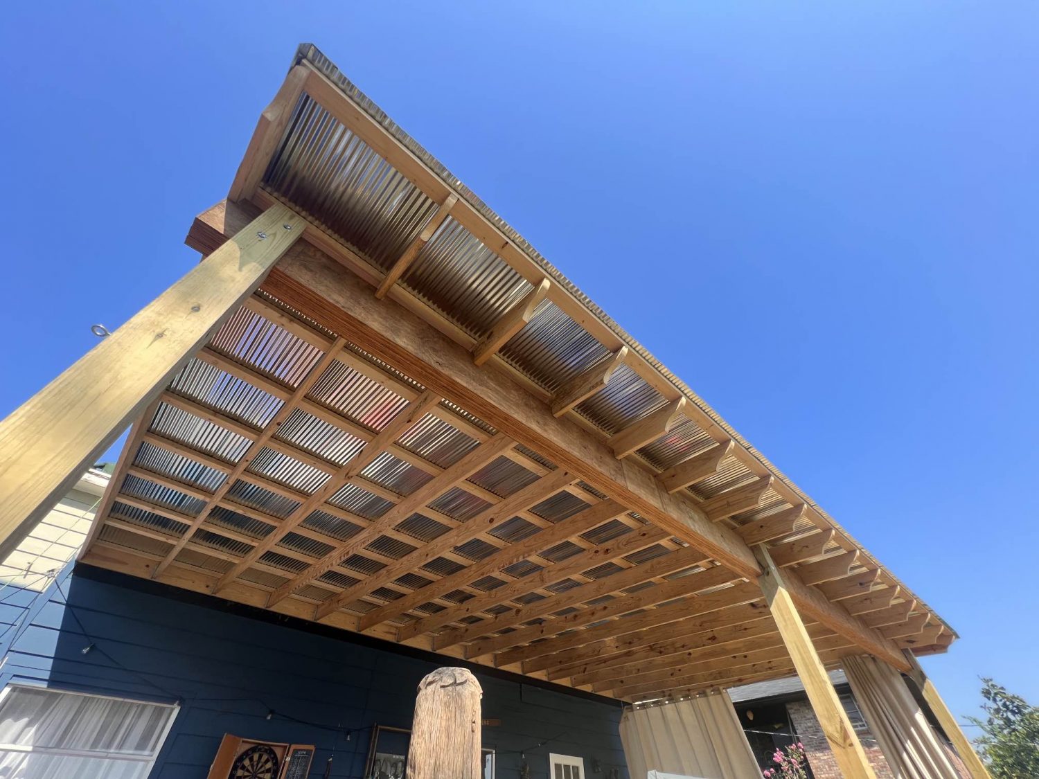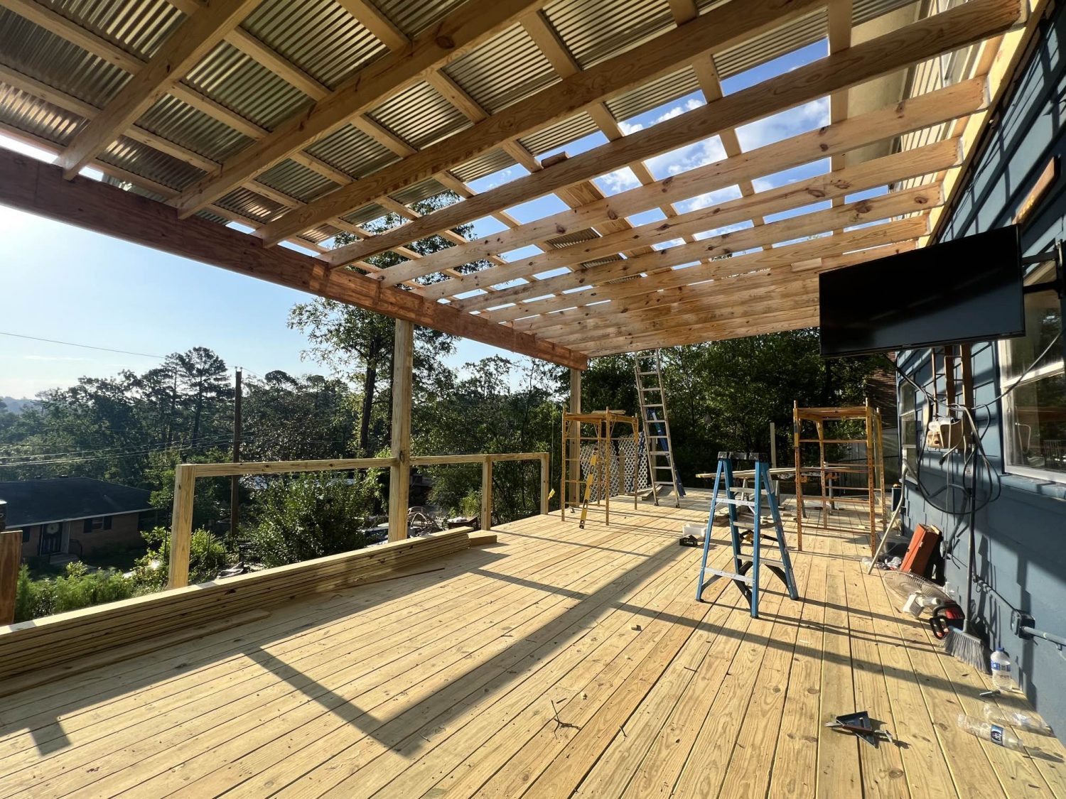 This was a heavy carpentry project. We completely dismantled what was left of the deck and built a new one its place, from the ground up. The customer quipped in their Google review that no tornado would tear this deck down. We had to rebuild the deck, the covered area and roof, the fence and the stairs
