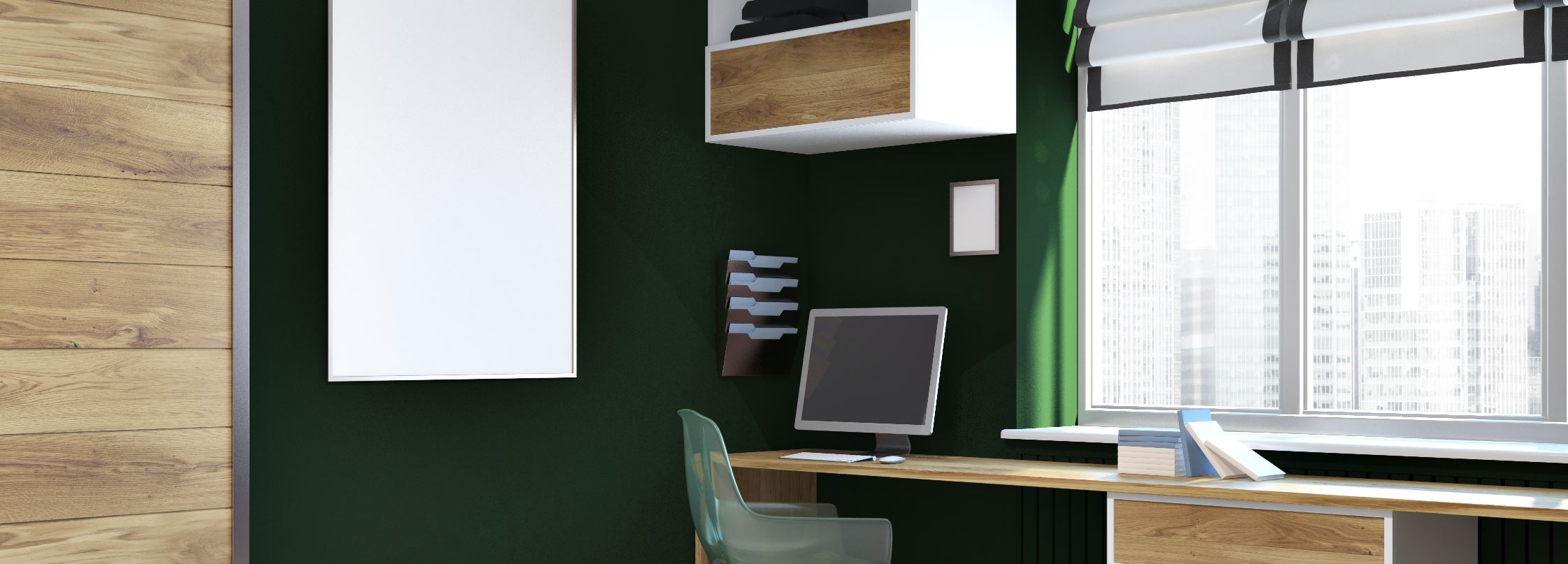 Do not shy away from bold, dark colors in your office. Use this black-brown sparingly but it’s a stylish and eye-catching option. While remaining understated, it’s chic in a sepia tone. Try this with a matte finish paired with stylish furniture to set the tone for your day.