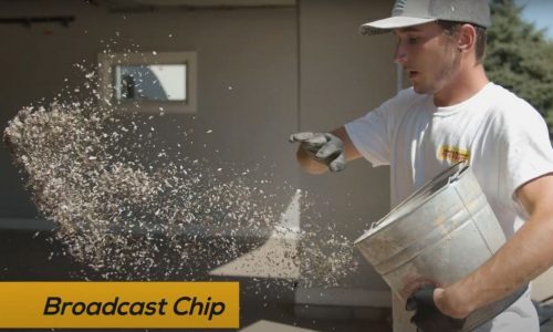 After floor prep, which include using a grinder on the floor and cleaning of the surface, a tinted base coat is applied on top of the concrete. Before the base coat dries, a layer of decorative chips are evenly spread across the surface and left to set for a few hours. Once dry, any excess chips are scraped off the surface and cleaned.
