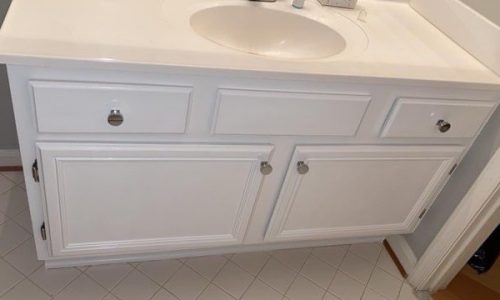 Painting often includes primer steps to help keep the finish durable. We then work our way around the hung cabinets, while still on the wall. This can be done by spray, hand, roller, or brush.