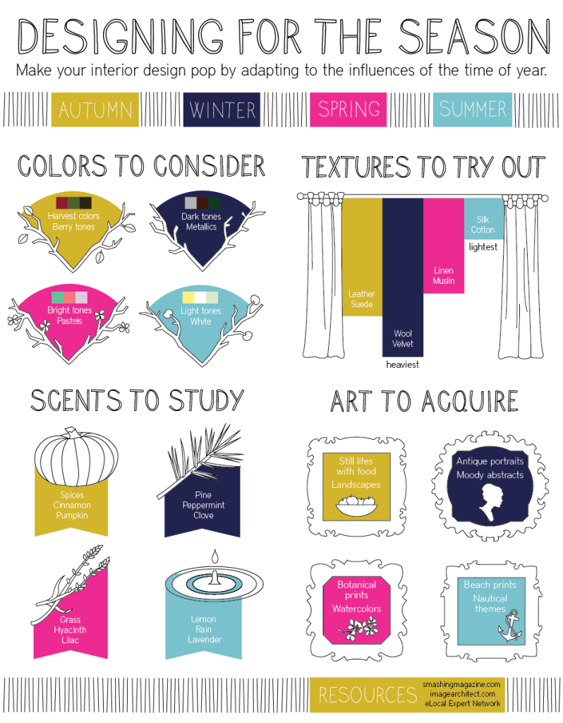 What if we all lived our lives according to the seasons? Sure, this is what Mother Nature intended and how things once were, but to us the thought is so foreign. But what if we ate only in season produce? What if we migrated during cold or storm seasons? And what if instead of just breaking out our summer clothes or putting up santa figurines for Christmas, we actually redecorated our homes by season (not holiday)? It would bring a whole new meaning to spring cleaning, that’s for sure. This doesn’t have to be a total renovation; you would just focus on four simple areas: color, texture, scent, and art. The infographic above displays this perfectly. The ultimate goal is to give your home the ambiance of that season. For instance: During the summer we want to keep everything light mostly because of the heat. Light blues, whites and yellows compliment summer; cottons and silks have a cool crispness to them that keeps us from getting too hot; you want your scents to be clean and not too abrasive, and finally, the art work you choose should compliment the furniture you already have and reflect all the best elements of summer: sun, the beach, waves, storms, etc. What’s your favorite seasonal decor?