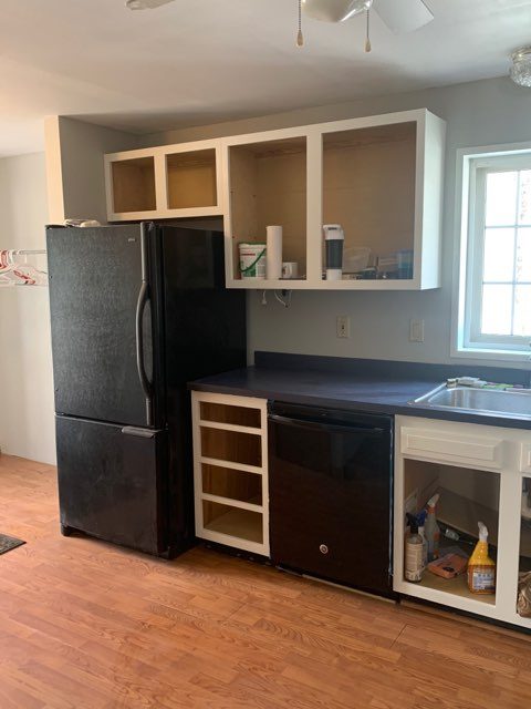 Uninstalled, newly painted kitchen cabinet doors drying. We remove the doors and drawer fronts to avoid overspray and drips.