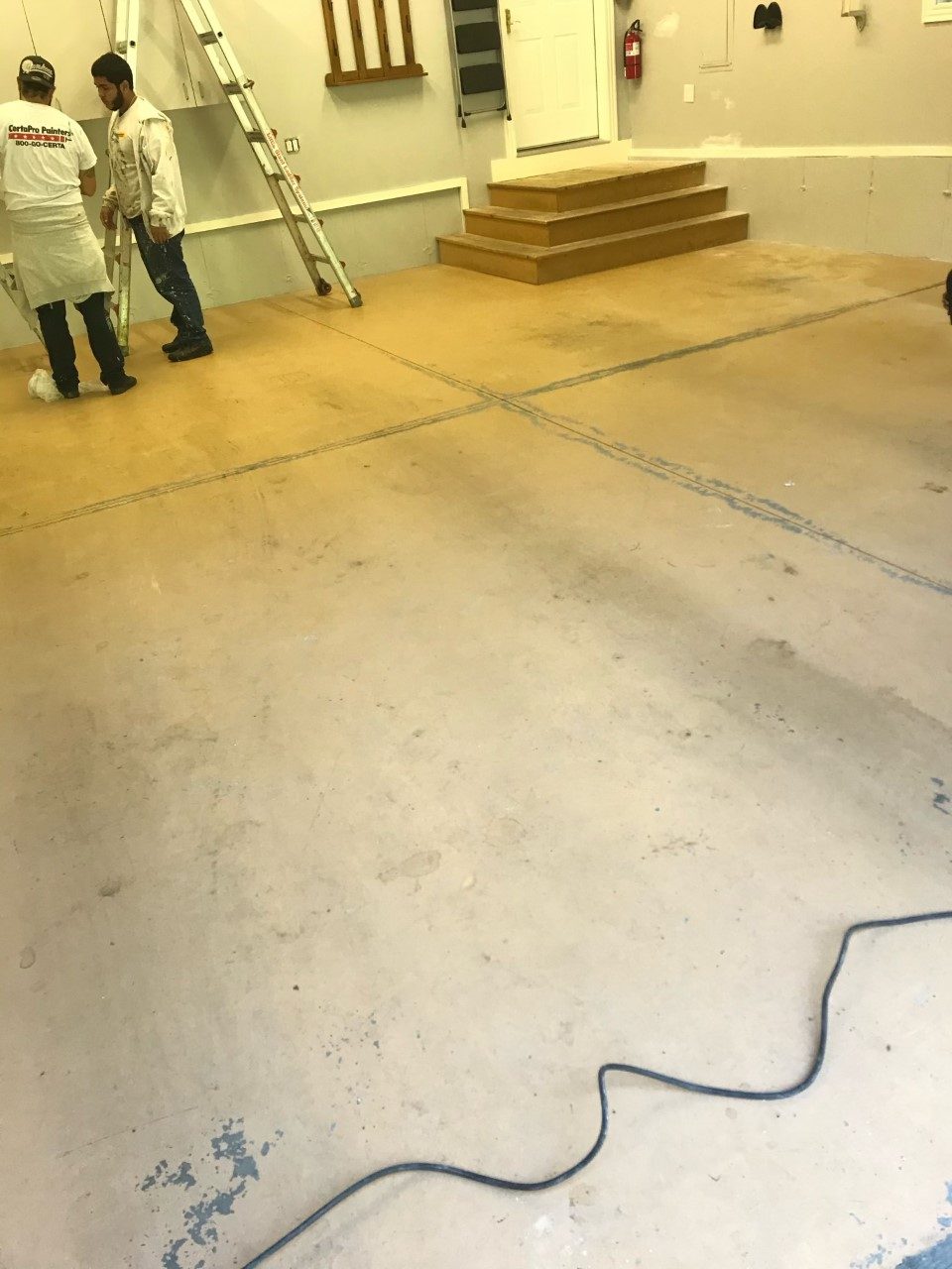 You may not know that CertaPro Painters of Maine also provides floor-coating surfaces. Turn your old worn garage floor into showroom quality. While the big box stores offer plenty of DIY kits, if you want the coating to last, you need to pay close attention to surface preparation and a multi-step coating process. For this project in Falmouth, Maine, we used a grinder to remove the old DIY peeling and flaking coating. Then we completed a full acid wash to make sure the flooring coating would penetrate and adhere to the concrete. Then we applied a Base Coat, a Second Coat where we added the Metallic Flakes, and a hard high gloss finish coat with just a hint of non-skid additive. That way, we prevent hot tire pickup and ensure you do not slip on the floor when wet. See the transformation!