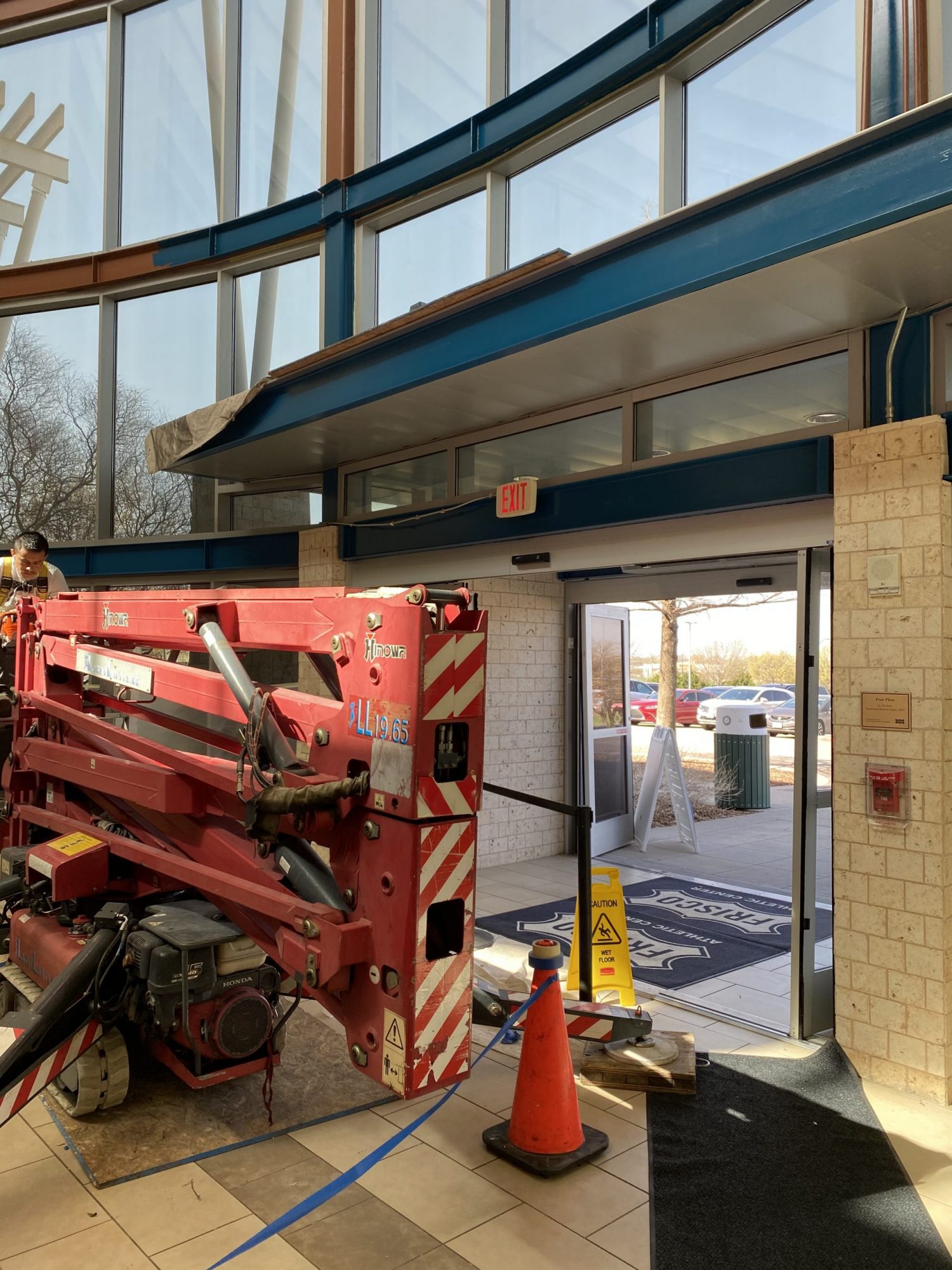 The lobby area is 3 stories high so we needed to get an atrium lift inside the facility to access the metals.