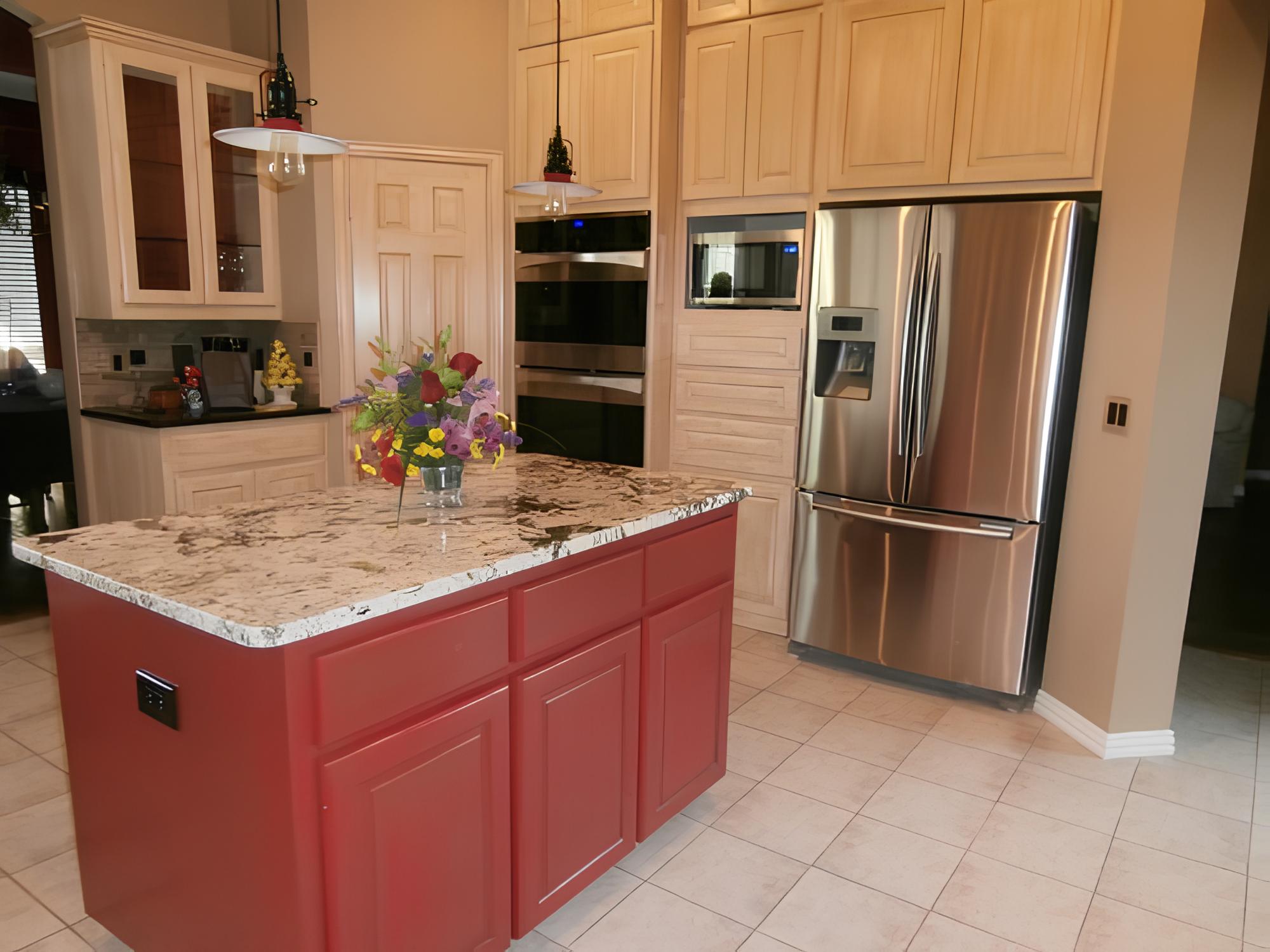 Recently, we completed a stunning project featuring vibrant red and tan kitchen cabinetry that transformed the entire space. The bold red cabinets bring a pop of color and energy to the room, while the tan cabinets provide a warm and inviting balance. This combination creates a modern and stylish look that’s perfect for any home. If you’re considering a fresh new look for your living area, our team is ready to help you bring your vision to life. Whether it’s a bold color change or a subtle update, we have the expertise to make it happen.