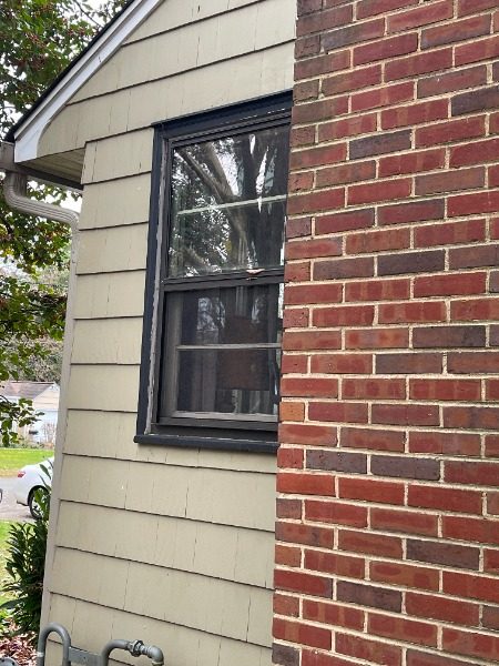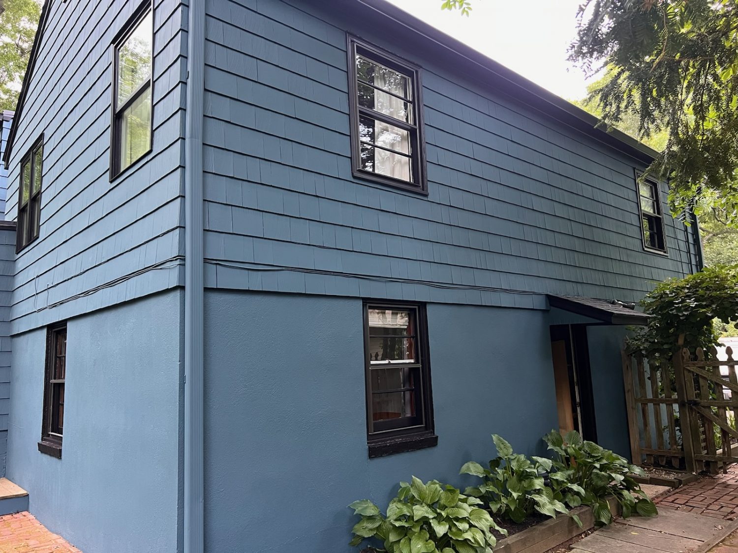 Complete transformation on the exterior of this house. We used the high tech sprayer to lay the “New Providence Navy” evenly over the exterior surfaces. The final touch was painting the black trim.