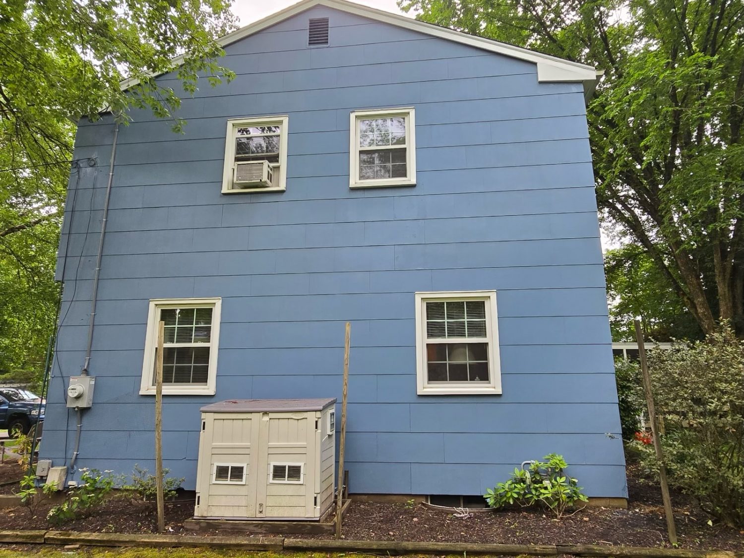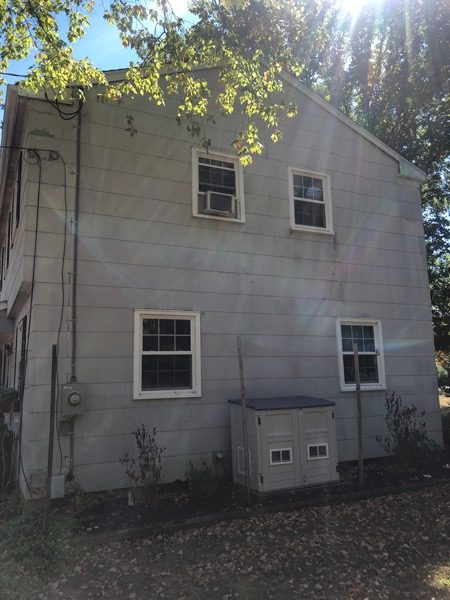 The house had not been repainted in years, leading to a state of significant disrepair. The soffits, in particular, were badly rotted and had been compromised by wild animals. The extensive damage left the homeowners doubtful about the feasibility of repairs. The overall exterior was weathered, with visible dirt and failing coatings.
