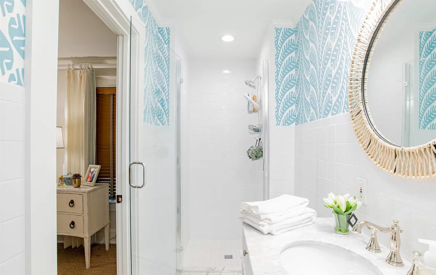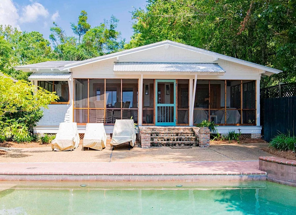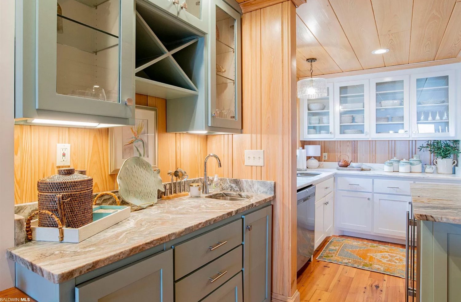 Interior and Exterior Refresh of a Charming Waterfront Cottage on Mobile Bay, including Kitchen Cabinets and Wallpaper.