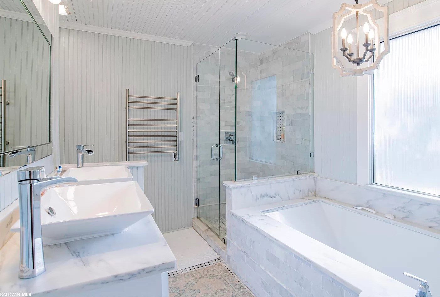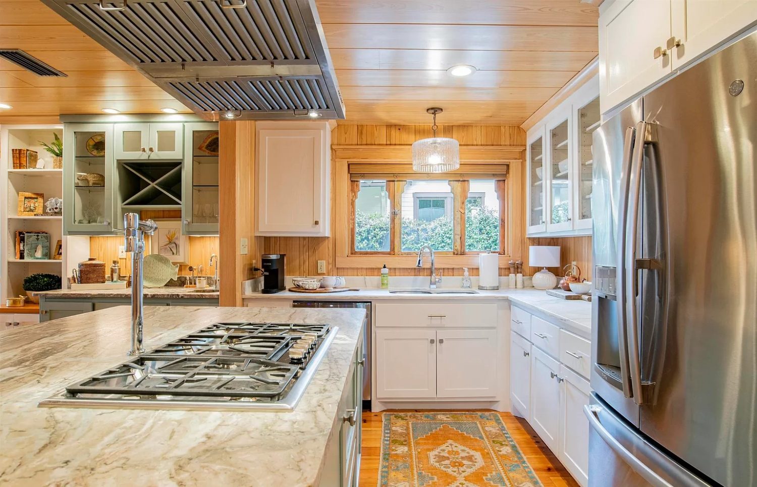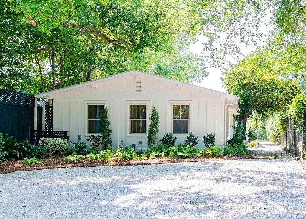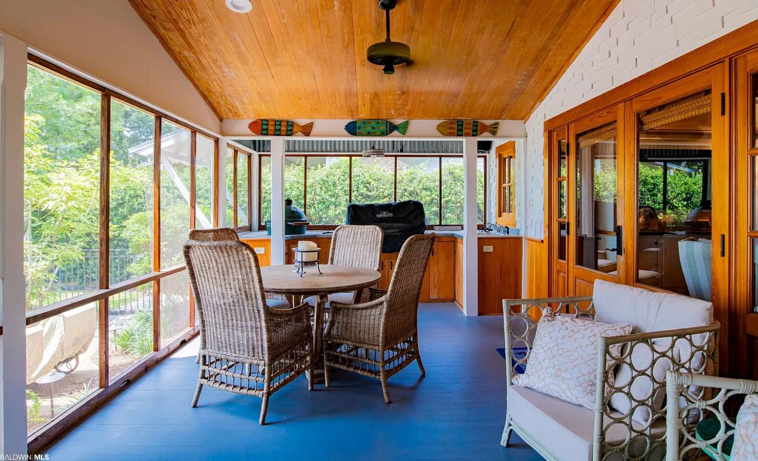 Interior and Exterior Refresh of a Charming Waterfront Cottage on Mobile Bay, including Kitchen Cabinets and Wallpaper.