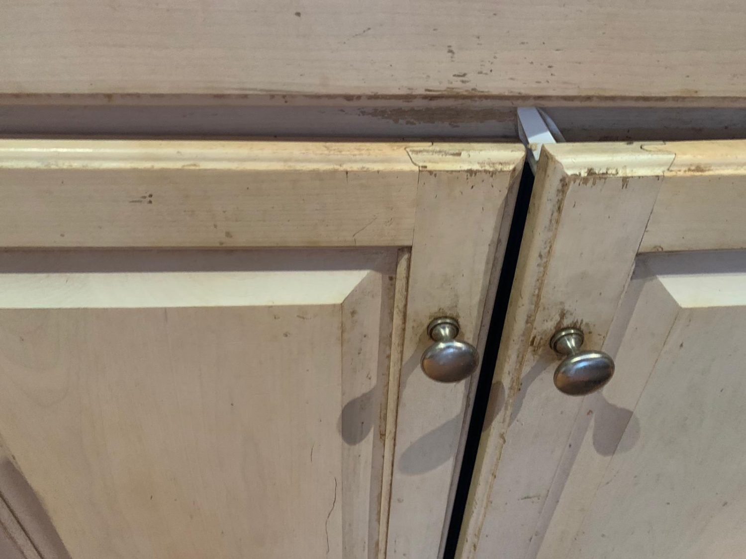 - Dirt & Stains – Before applying the new paint, our CertaPro team had to skillfully clean all of the cabinets, which had various stains, sticky substances, and peeling paint from previous coats