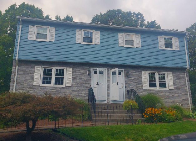 The finished project is a blue and stone facade that is ready to withstand the weather and protect the home while looking beautiful. We also painted the metal storm doors on both sides to freshen them up.