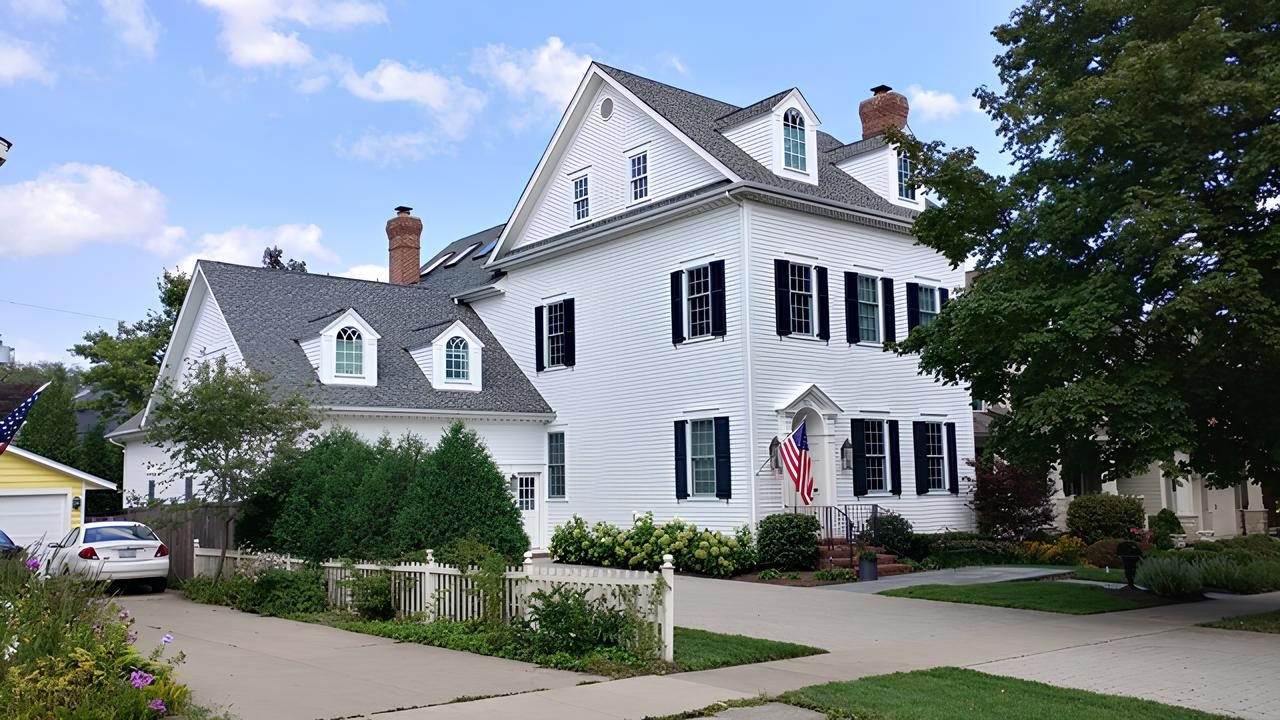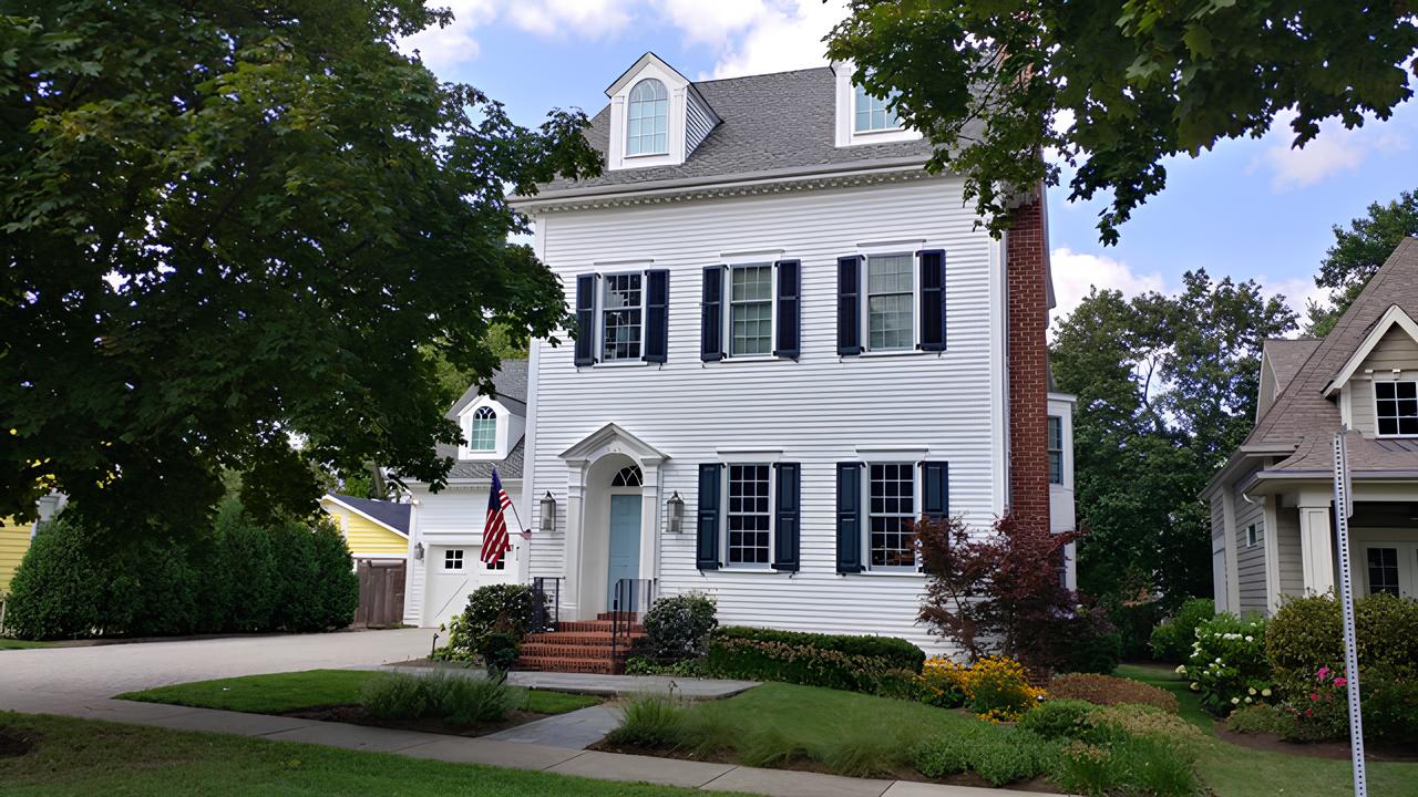 This stately Colonial-style home has been beautifully refreshed with a crisp white exterior that exudes timeless elegance. The deep navy shutters add a striking contrast, enhancing the home’s symmetrical design and classic charm. A soft blue front door, framed by an arched entryway, provides a welcoming touch that complements the traditional brick steps leading to the entrance. The tall, dormered windows on the third floor add character and depth, while the prominent brick chimney reinforces the home’s historic appeal. Surrounded by lush greenery, manicured hedges, and vibrant flower beds, the landscaping perfectly frames the home, adding to its curb appeal. This exterior update preserves the home’s traditional aesthetic while giving it a fresh and sophisticated new look.