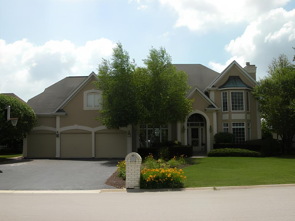 This elegant home has been beautifully updated with a sophisticated taupe exterior that enhances its stately architectural design. Crisp white trim accentuates the intricate detailing, from the decorative window frames to the grand arched entryway, adding depth and contrast. The striking rooflines and expansive windows contribute to the home’s commanding presence, while the well-manicured landscaping, featuring vibrant yellow flowers and lush greenery, creates an inviting curb appeal. The spacious three-car garage blends seamlessly into the design, framed by subtle arch details that complement the home’s refined aesthetic. This fresh exterior update brings a modern yet timeless appeal, ensuring the home remains a standout in the neighborhood.