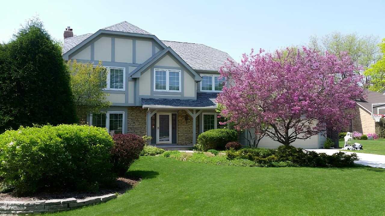The freshly painted exterior of this stunning two-story Tudor-style home brings out its elegant architectural details with a harmonious blend of neutral tones. The light beige walls contrast beautifully with the soft gray trim, accentuating the characteristic half-timbered façade. The stone accents around the entryway add a timeless touch, while the dark gray roofing provides a cohesive and balanced aesthetic. Large, symmetrically placed windows invite natural light into the home, enhancing its curb appeal. The front yard is lush and well-manicured, featuring a vibrant green lawn and thoughtfully arranged landscaping. A striking pink flowering tree stands proudly in the yard, adding a burst of color and charm. The fresh paint complements the home’s classic yet modern appeal, making it a standout in the neighborhood.