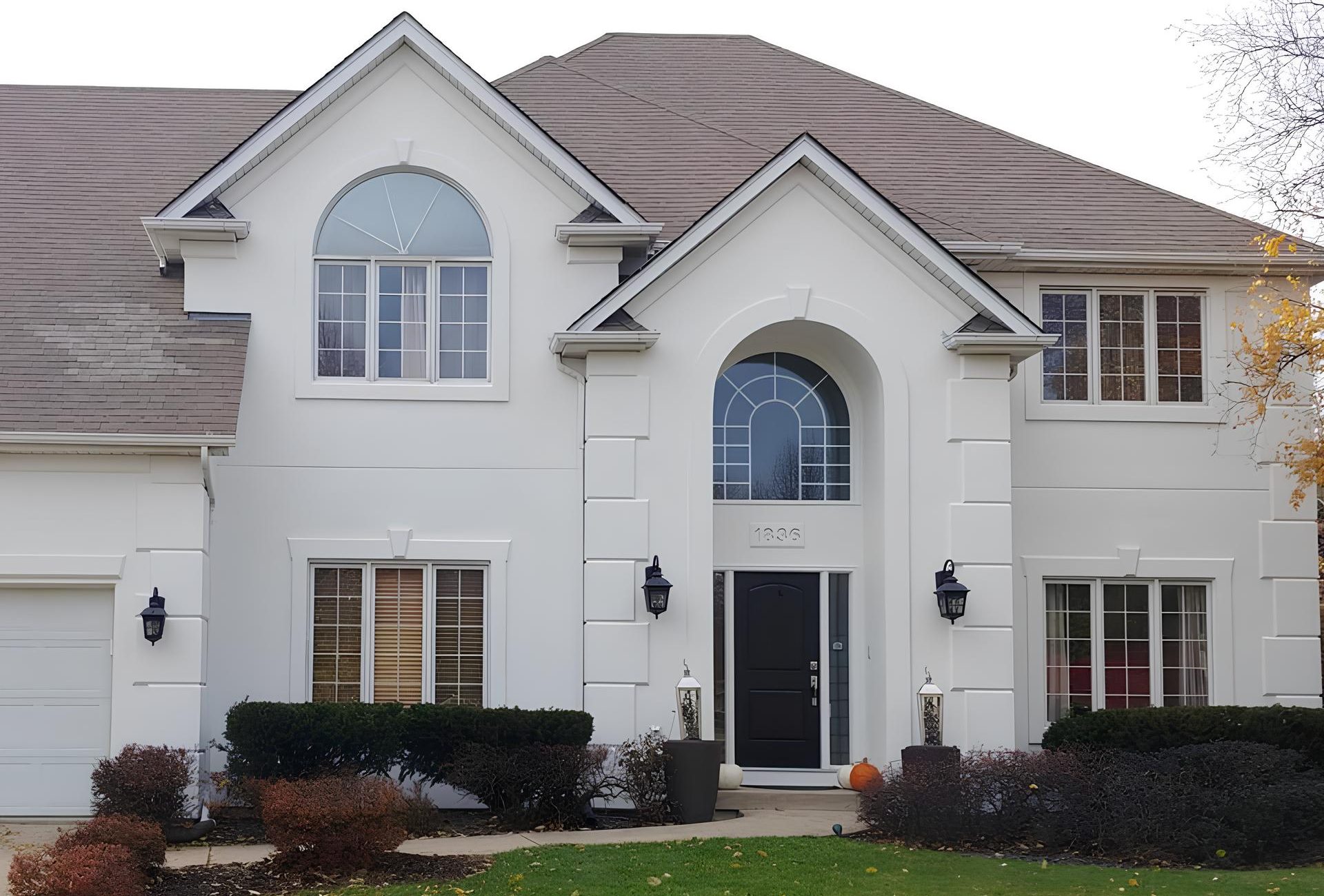 This beautifully updated home boasts a pristine white stucco exterior that radiates elegance and sophistication. The symmetrical façade is highlighted by striking architectural details, including arched windows and a grand entrance framed by a soaring archway. The contrasting black front door adds a bold and timeless touch, flanked by decorative sconces that enhance the home’s stately presence. Crisp white trim and subtle molding accents around the windows and entryway further elevate the refined aesthetic. The manicured landscaping, with neatly trimmed hedges and seasonal foliage, provides a welcoming curb appeal. This fresh exterior update enhances the home’s modern luxury while preserving its classic charm.