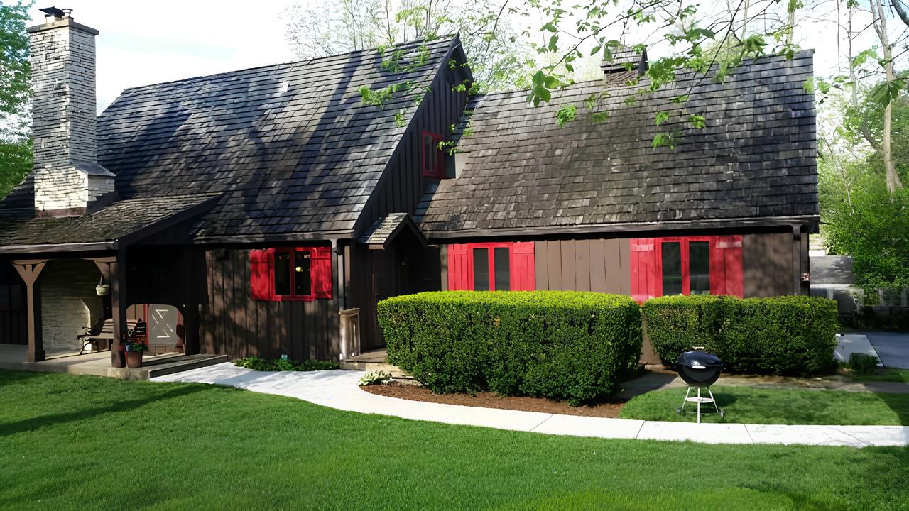This charming cottage-style home has been beautifully refreshed with a rich, earthy brown exterior that complements its natural surroundings. The striking red window shutters add a bold pop of color, enhancing the home’s rustic appeal and giving it a cozy, storybook charm. The steeply pitched roof, clad in weathered wood shakes, adds character and blends seamlessly with the wooded backdrop. A stone chimney and covered porch further emphasize the home’s inviting, cabin-like aesthetic. The well-maintained landscaping, featuring neatly trimmed hedges and a lush green lawn, frames the home beautifully, while a winding walkway welcomes guests to the front entrance. This fresh exterior update preserves the home’s timeless charm while making it feel warm and inviting.