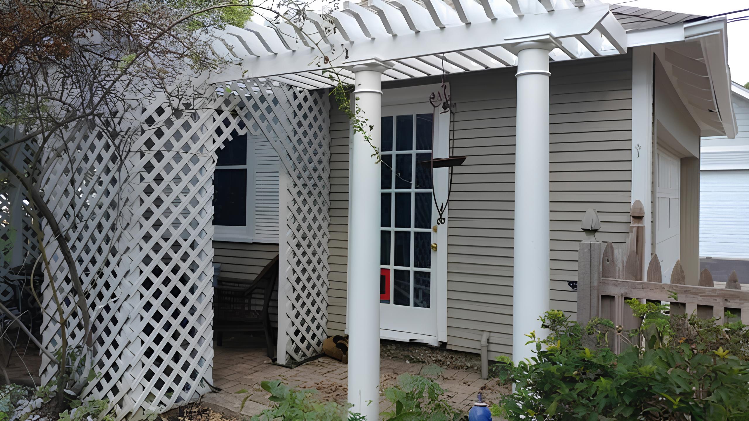 This beautifully designed outdoor space blends elegance and functionality with a charming pergola that adds a touch of sophistication. The crisp white lattice and columns create a light and airy atmosphere, offering a perfect balance of shade and openness. The neutral-toned siding on the house complements the classic look, while the French door, with its delicate window panes, enhances the inviting appeal of the space. A brick-paved patio adds warmth and texture, making this a cozy retreat for relaxation or entertaining. The surrounding greenery and rustic wooden fence bring a natural element that softens the structure, making it feel like an extension of the home’s interior. This thoughtful design creates a serene and welcoming backyard oasis.