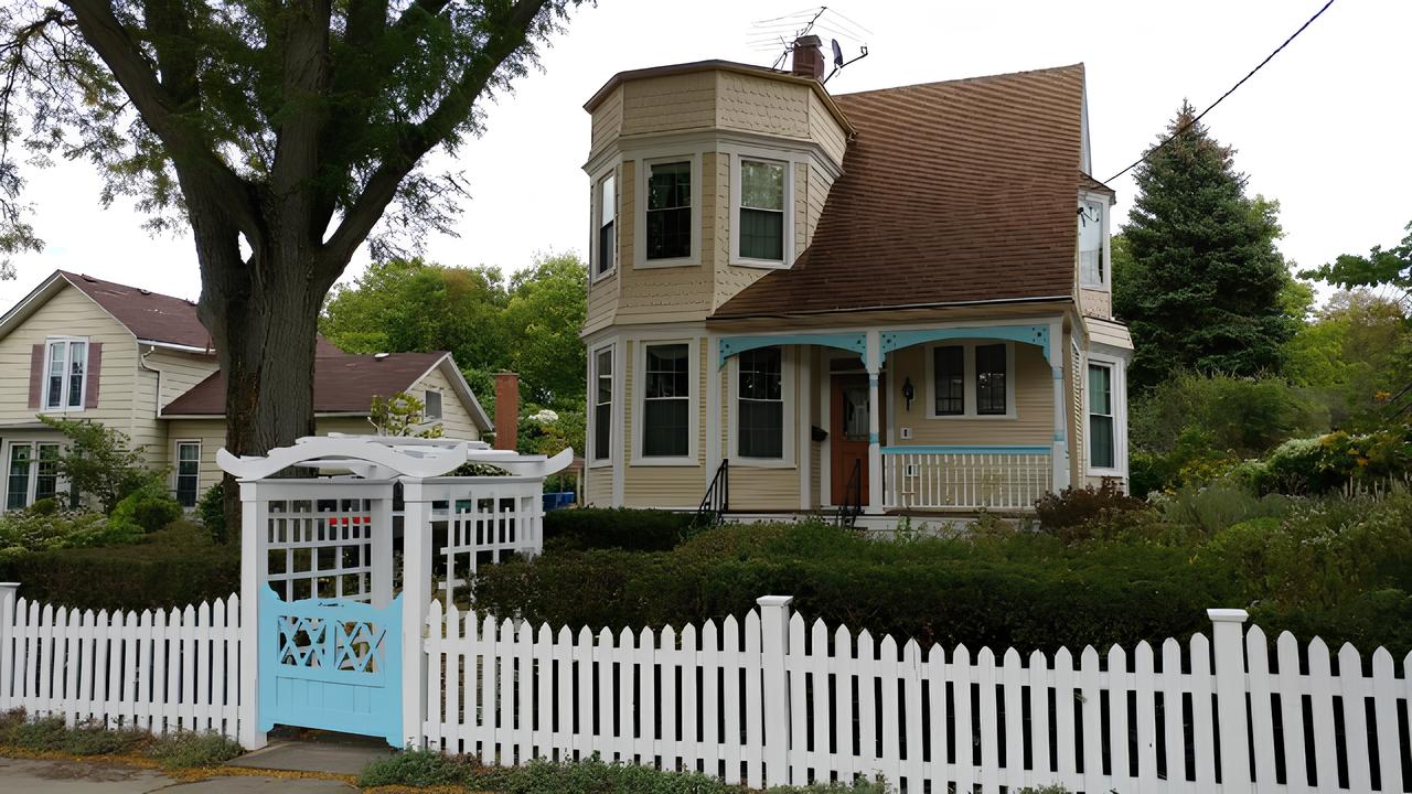 This charming Victorian home has been beautifully refreshed with a warm, buttery yellow exterior that enhances its historic elegance. The intricate detailing of the bay windows and scalloped shingles adds depth and character, while the soft blue accents on the porch trim and garden gate introduce a whimsical touch. A crisp white picket fence frames the property, adding to its storybook appeal, and the arbor-style gate provides a welcoming entrance. The covered front porch, supported by delicate columns, invites relaxation, offering a cozy spot to enjoy the lush greenery surrounding the home. The steeply pitched roof and unique turret design further emphasize the home’s vintage charm, making it a standout piece of classic architecture with a fresh and inviting look.