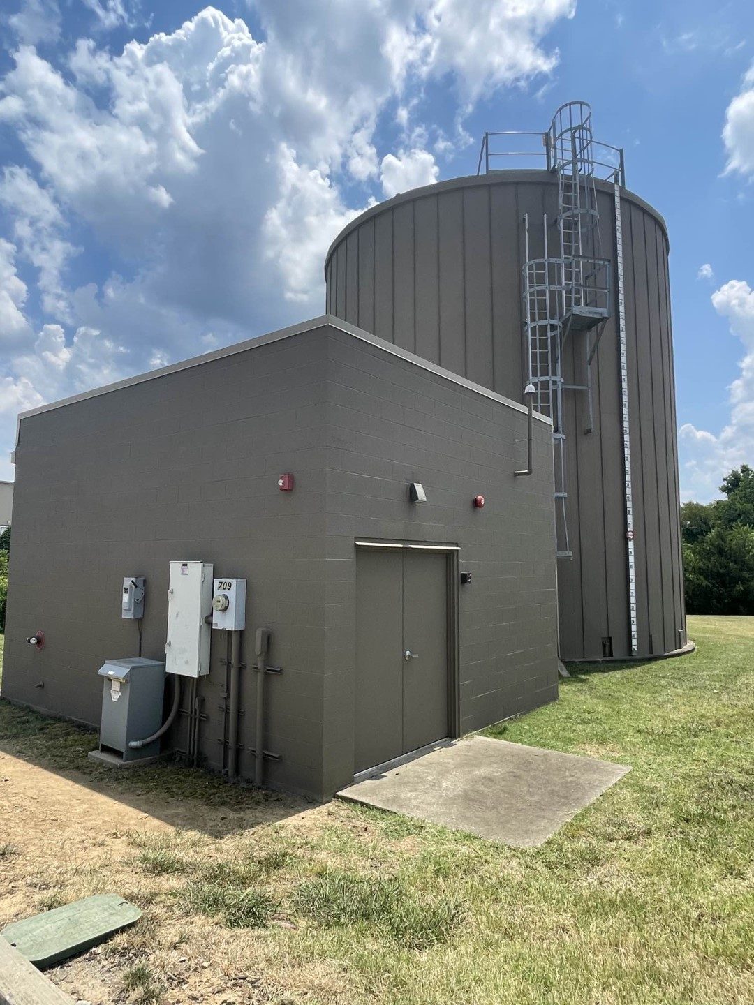 The newly painted water storage tank and utility building stand tall with a clean, durable finish, enhancing both appearance and longevity.