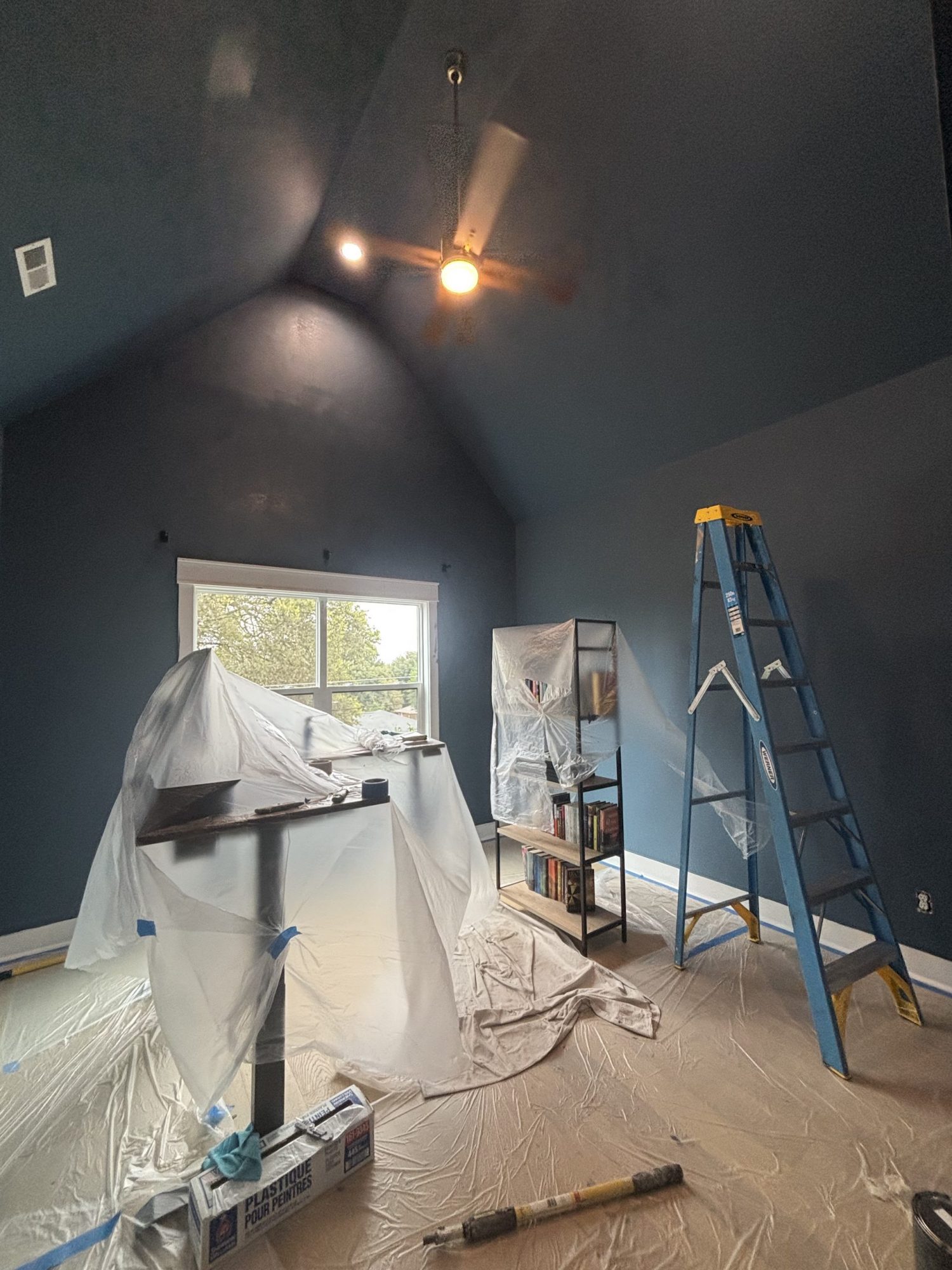 Because of the dark color change, the space required nearly three coats of paint to ensure full coverage and eliminate roller marks. The room’s tall ceilings required the crew to bring specialized access equipment, but the team was still able to complete the project efficiently in just a day and a half, delivering a striking and polished final result.