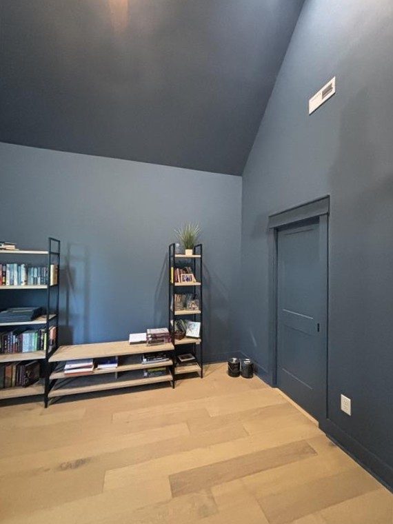 The walls, doors, ceiling, and trim were all painted in the same deep blue color while varying the paint sheen to create subtle contrast and durability. Satin was used on the walls and doors, flat paint on the ceiling, and semi-gloss on the trim.