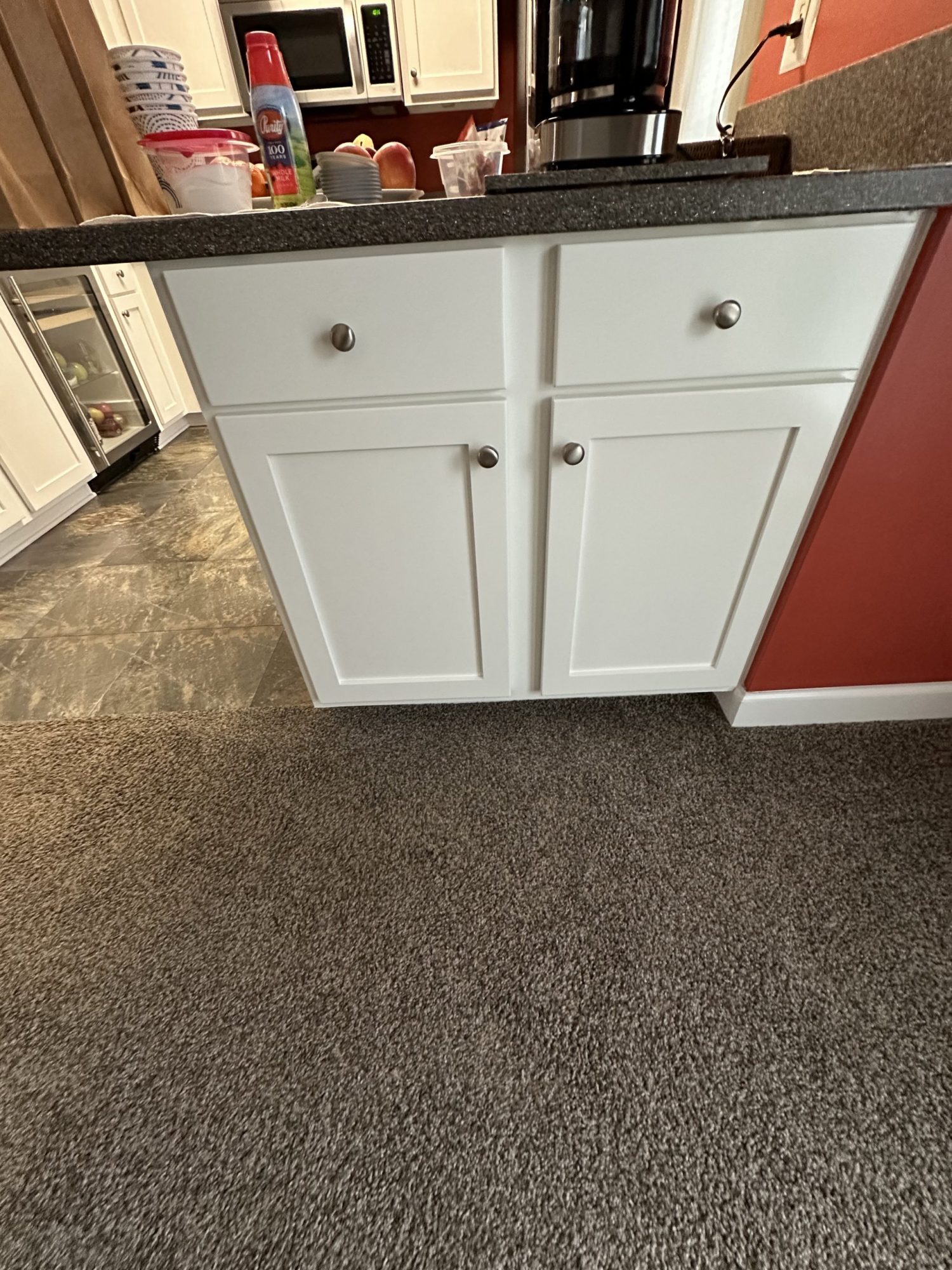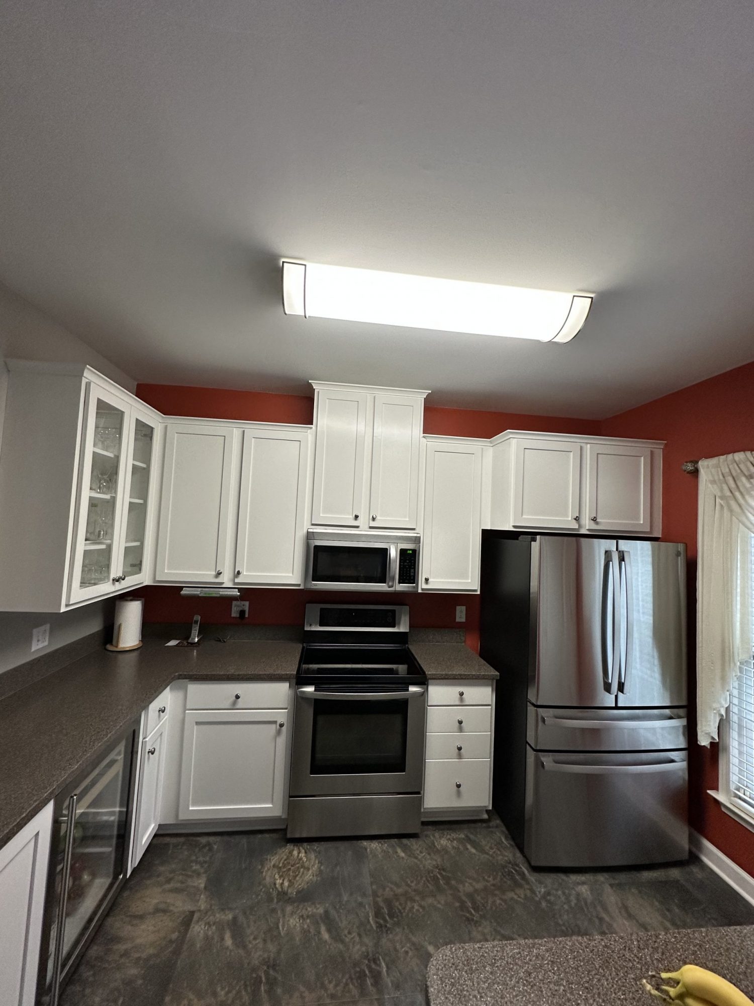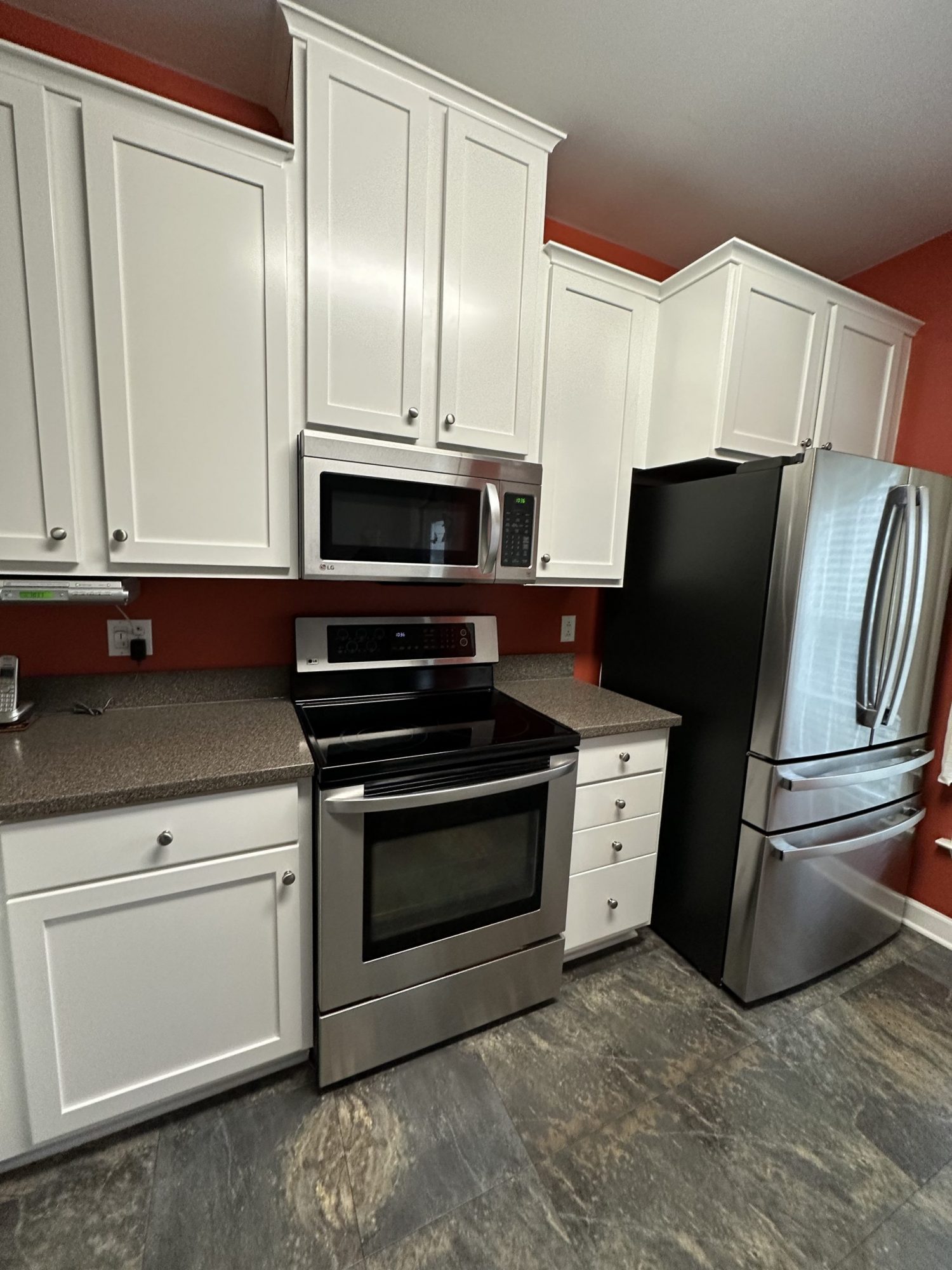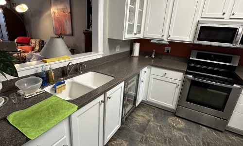 The entire project was completed in just two days, delivering a dramatic kitchen refresh. The newly painted cabinets now provide a bright, modern look that complements the existing countertops, flooring, and appliances while giving the kitchen a completely updated appearance.