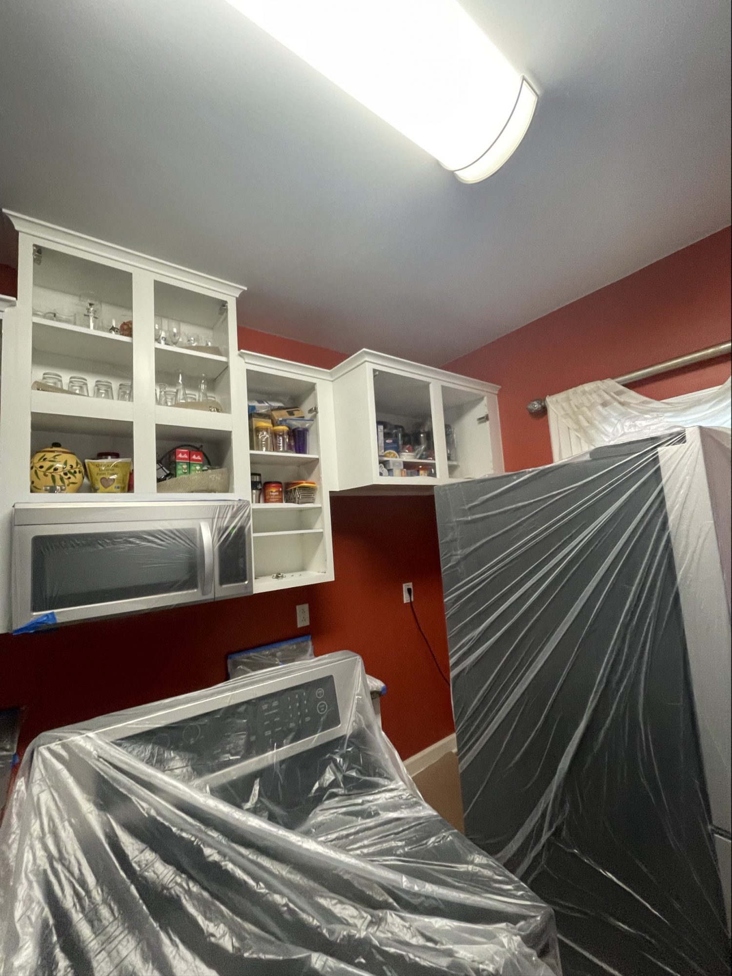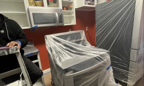 During preparation, cabinet doors were carefully removed and transported offsite for professional finishing. Inside the kitchen, surfaces were sanded and protected while the team prepared the cabinet frames, pantry door, and island for new paint.