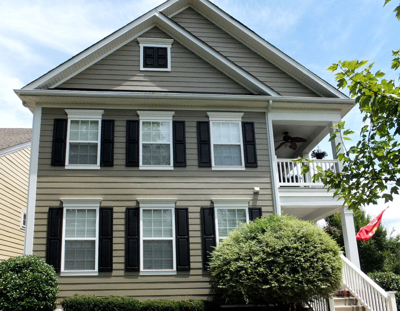 Dark shutters work well to highlight the windows on this home, creating a beautiful example of contrasting colors and how they work to make a house “pop.”