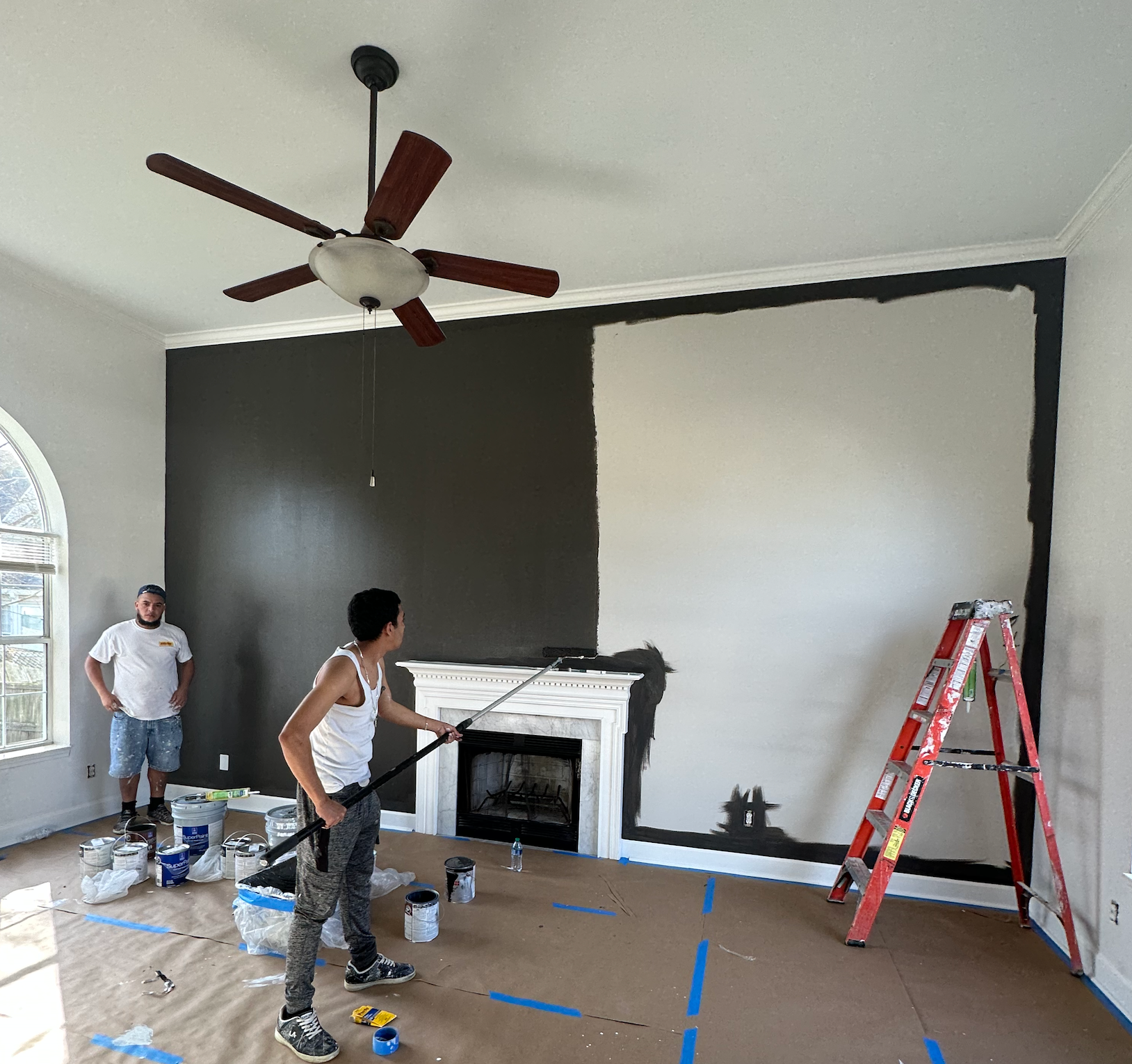 For those of our customers who are getting their house painted for the first time, it is often misunderstood how much prep goes into each project. In order to protect floors from dripping paint, it requires a lot of time and material to make sure that all surfaces are protected. Many companies cut this corner. We don’t! Great job Claudia!