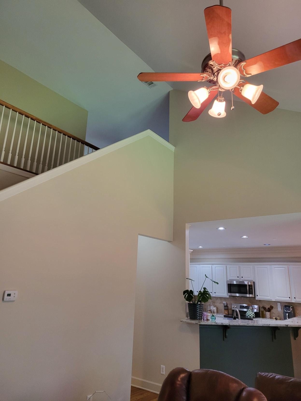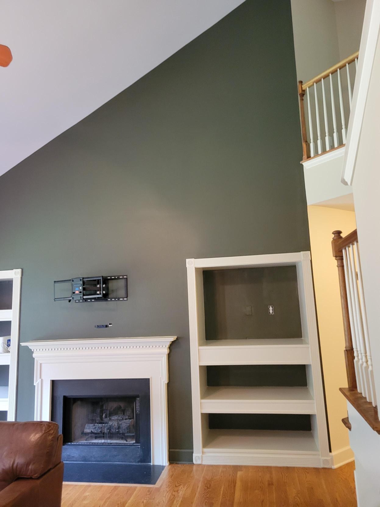 This home’s interior received a fresh update with newly painted walls, hallways, and a refreshed dining room area—bringing a cohesive look throughout the space. Even the built-in shelves were given a bold, updated color to match the home’s aesthetic.