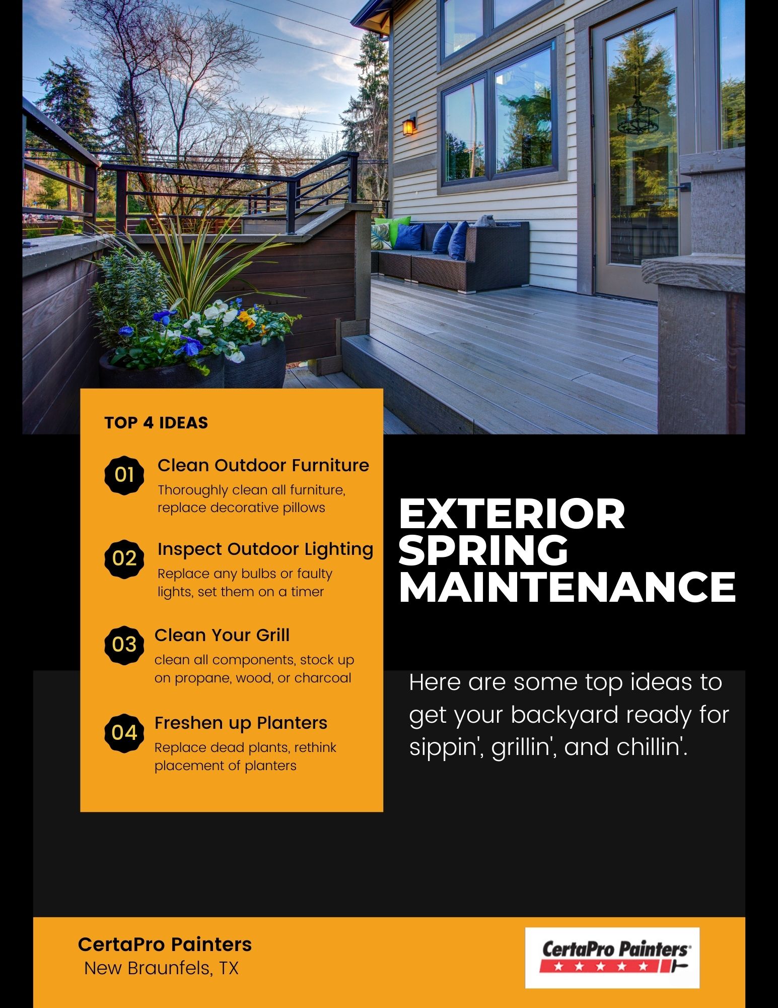 Here are some tips to get your backyard ready to enjoy our beautiful Spring weather here in Texas. These easy projects will make your backyard experience more enjoyable.
