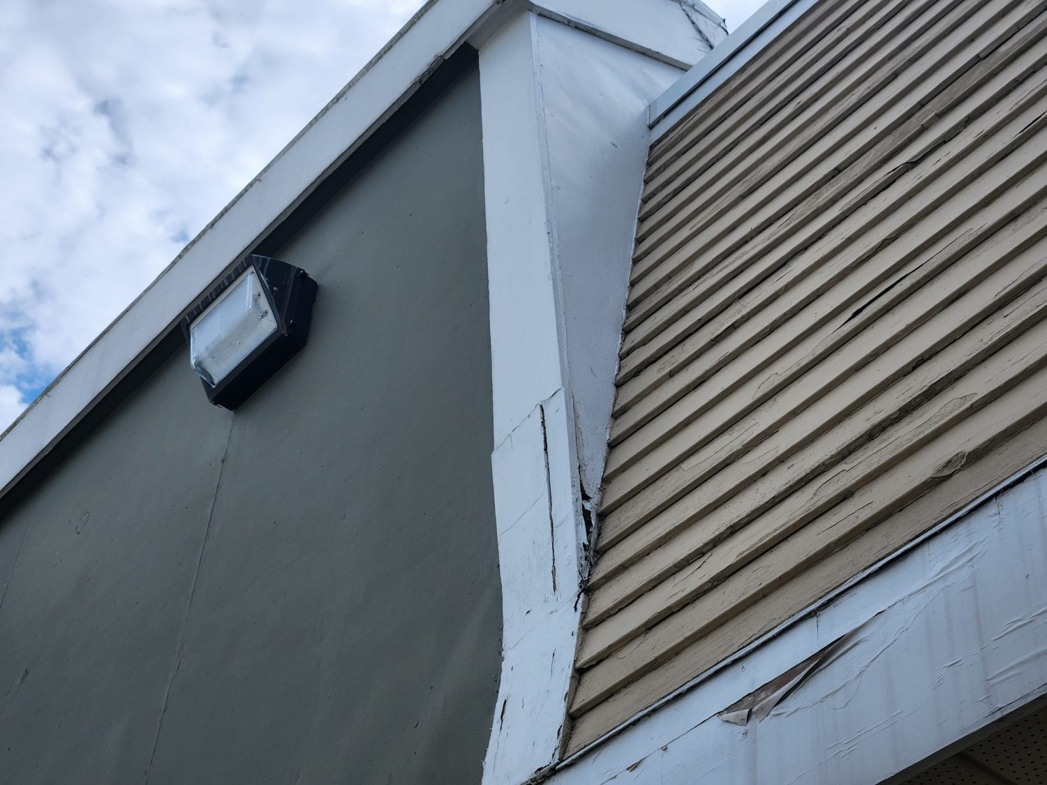 all of the right side of the plaza to remove all the peeling paint. We filled holes where old signage had been,
