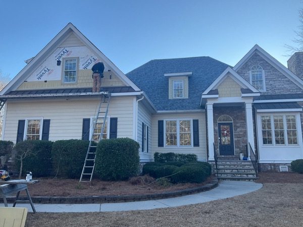 This project involved finishing and painting newly installed Hardie Plank siding for this home in Trent Woods, NC, where proper preparation was critical to protect the exterior and ensure a long-lasting, professional result.