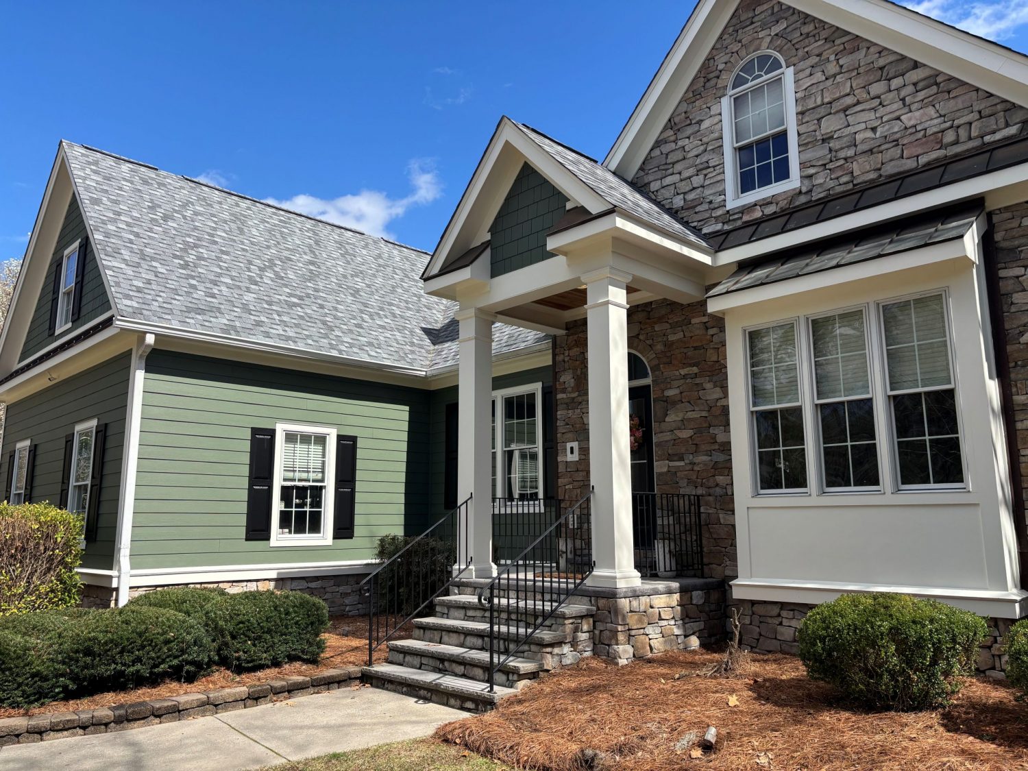The selected deep green body color paired with crisp white trim beautifully highlights the home’s architectural features and complements the existing stone accents, resulting in a durable, well-sealed exterior with strong curb appeal.