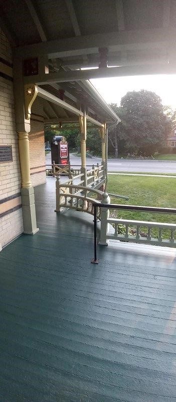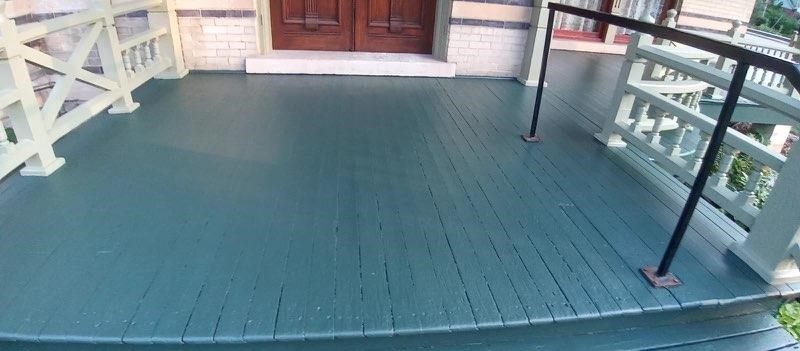 The porch floor boards were completely replaced and repainted to match the original color scheme.