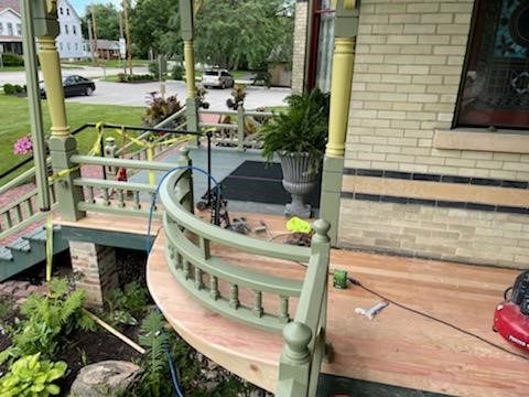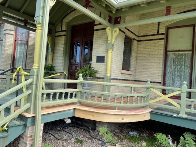 CertaPro Painters rebuilt the front porch staircases to match other 130 year old stairs on the building. To repairs the ornate posts the front porch ceiling was jacked up to replace the bottom portion of the posts. Tongues and groove boards on the porch floor were removed/replaced. Then everything was repainted to customer match the original paint scheme.
