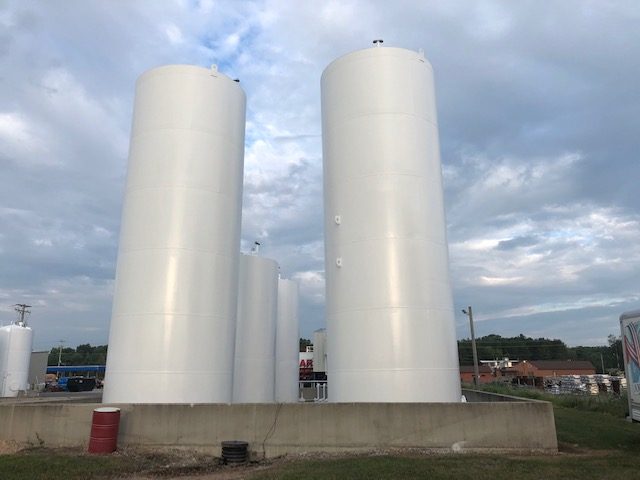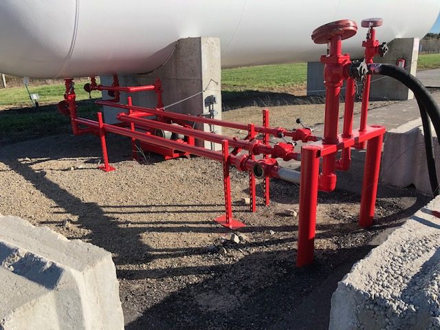 Garrow Oil & Propane in Appleton, WI has been a fuel supplier in Wisconsin for more than 50 years. Their property had 27 vertical and horizontal storage tanks in need of exterior surface maintenance. This was a big project that involved power washing the tanks with Tri-Sodium Phosphate to remove dirt and mildew, grinding and sanding the surface to remove rust, collecting and properly disposing of debris, and the application of 2 coats of ProIndustrial Alkyd Enamel Urethane/Semi-Gloss (Extra White) paint. In addition to the tanks them selves, the fuel lines were given similar treatment but in a safety red colored finish.