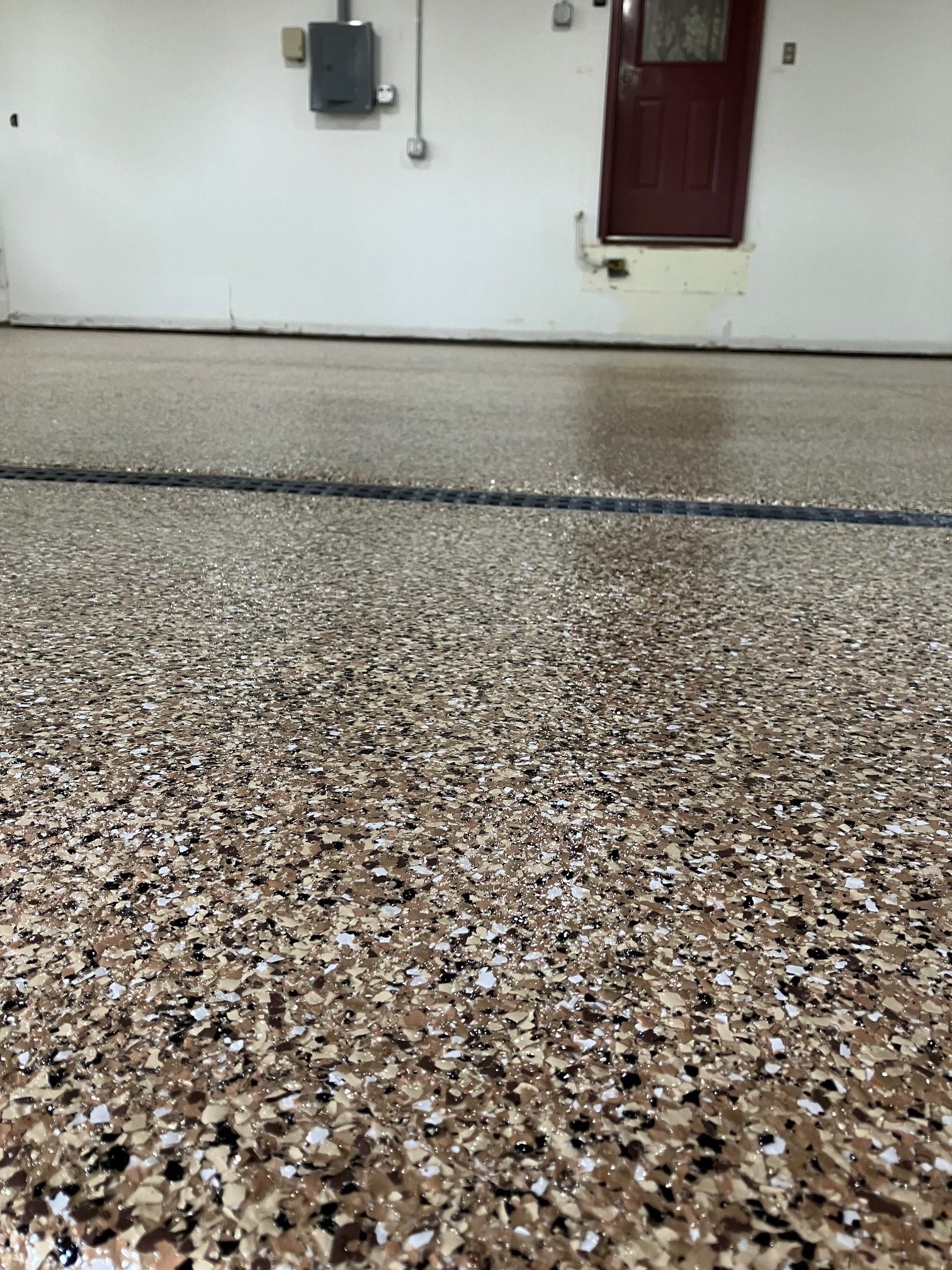 Jack and Morgan approved garage floor transformation! Color…Saddle Tan! This garage floor was updated in 1 day using a polyurea/flake concrete coating system.