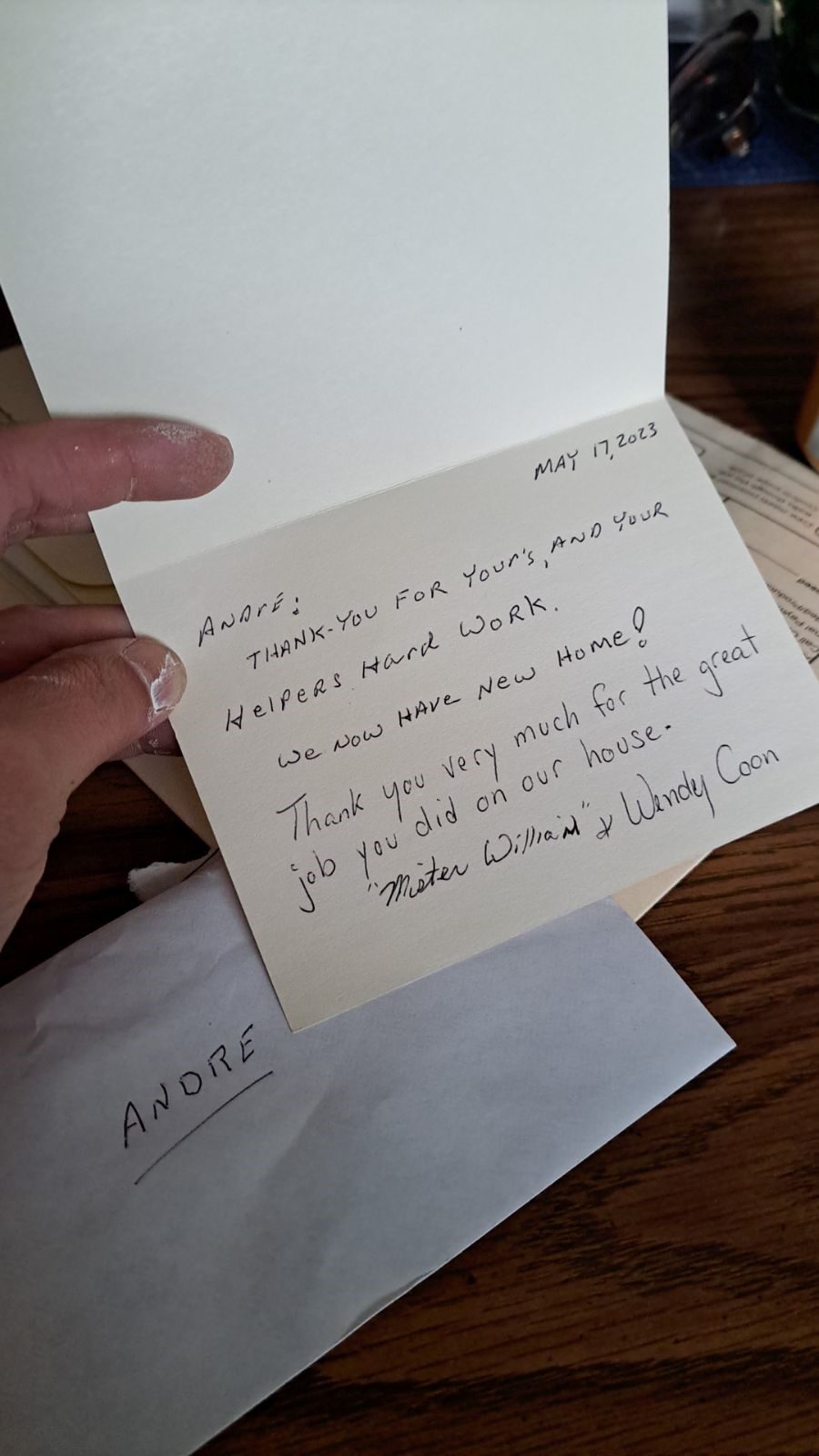 Mr. and Mrs. Coon, thank you for taking the time to hand write a thank you card for your job site supervisor, Andre! People don’t do that often these days. It was very kind. We appreciate it.