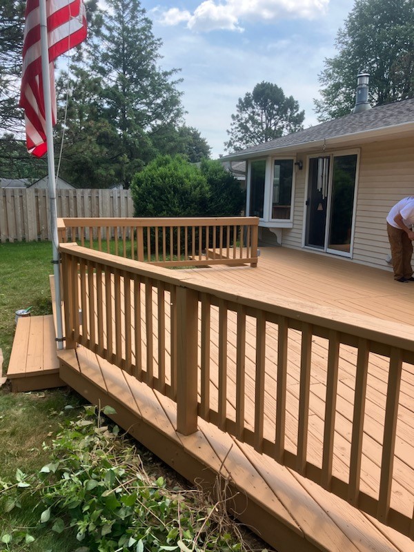 Was able to wrap up restaining this deck just before the July 4th weekend! Turned out great. Sherwin-Williams Super Deck Solid Stain was used. Color is Cedar (SW3034).