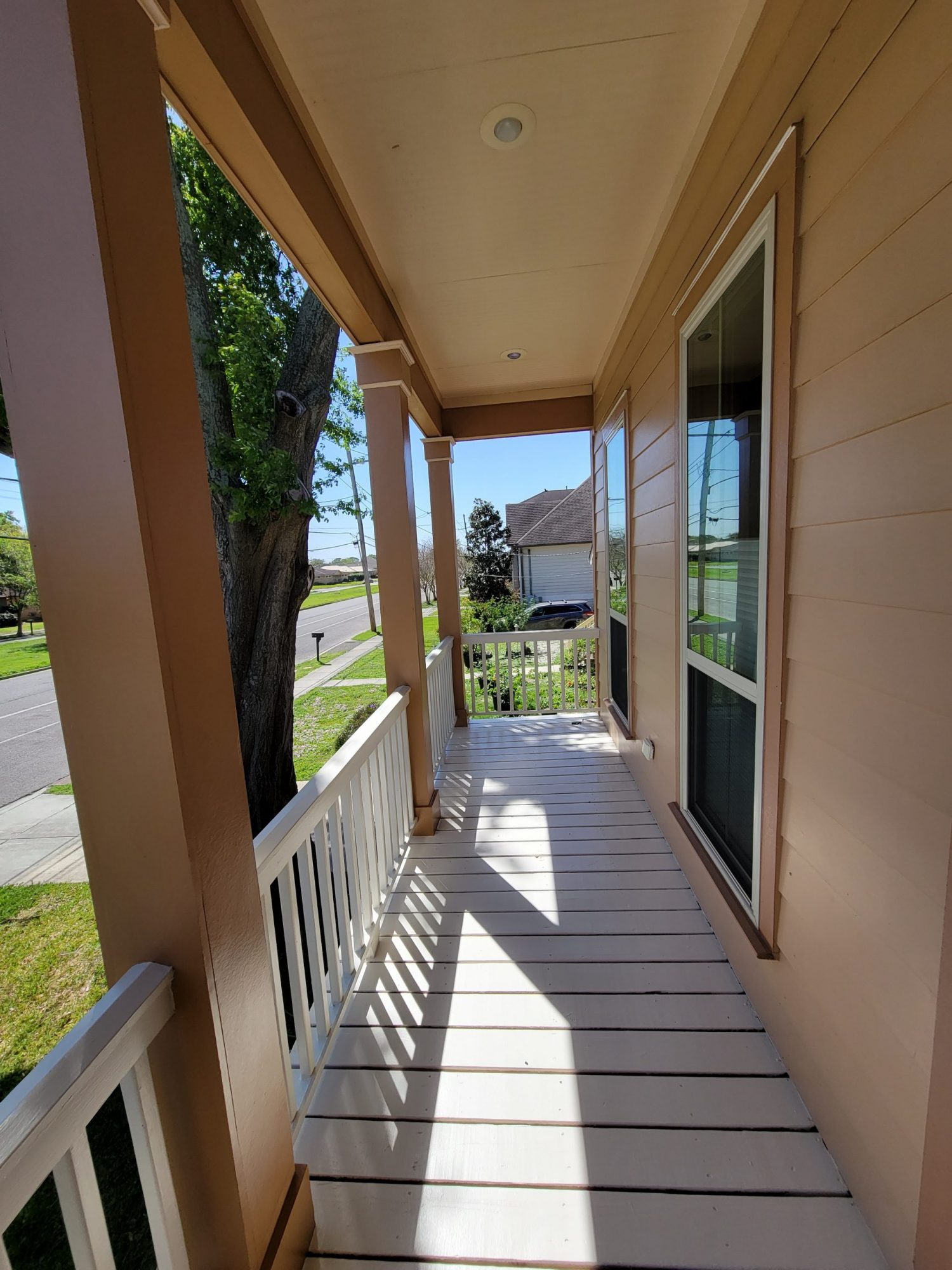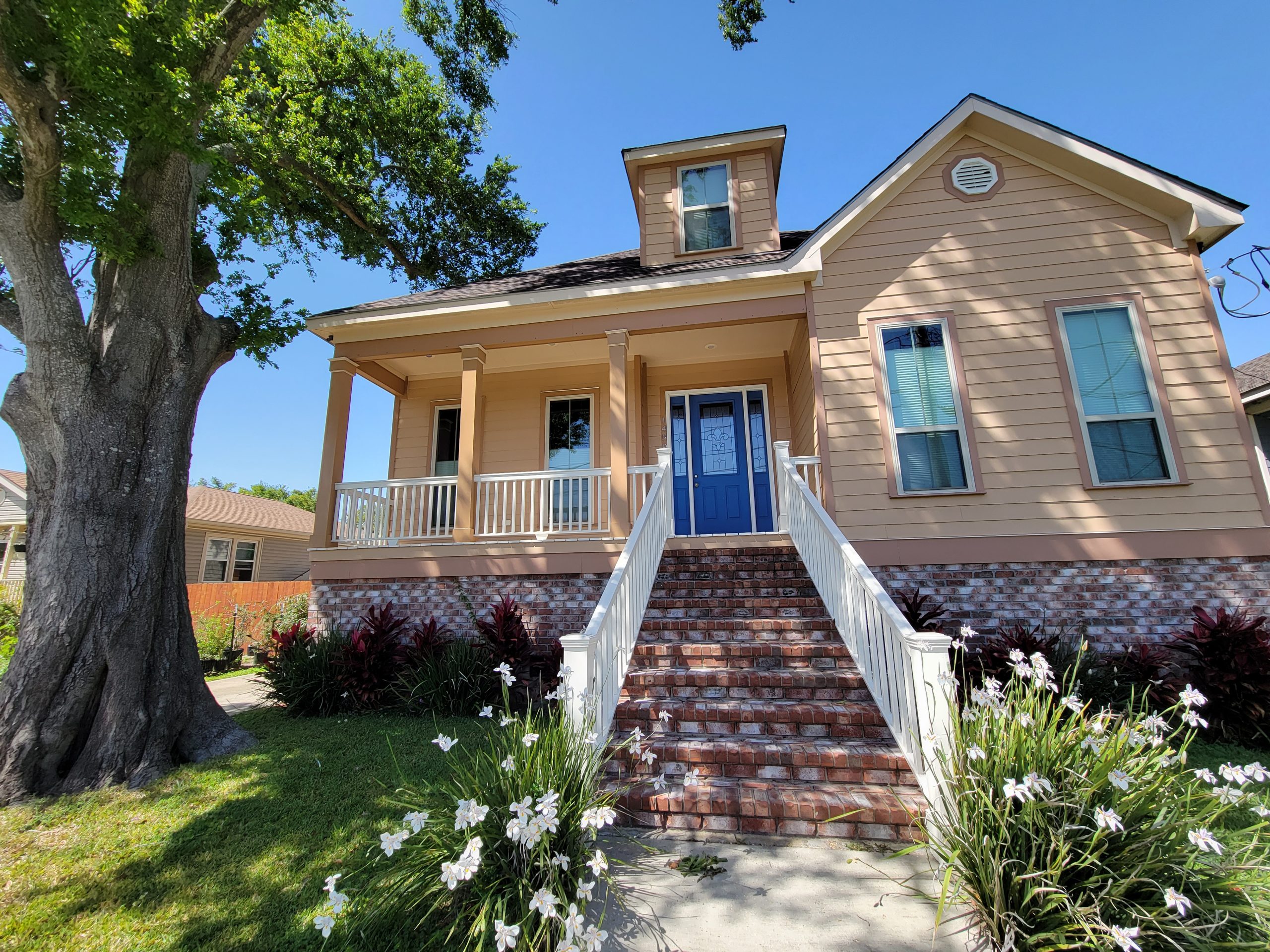 This home received a fresh tan color combination that gave it renewed curb appeal and for a bit of added style a bold blue was chosen for the front door color.