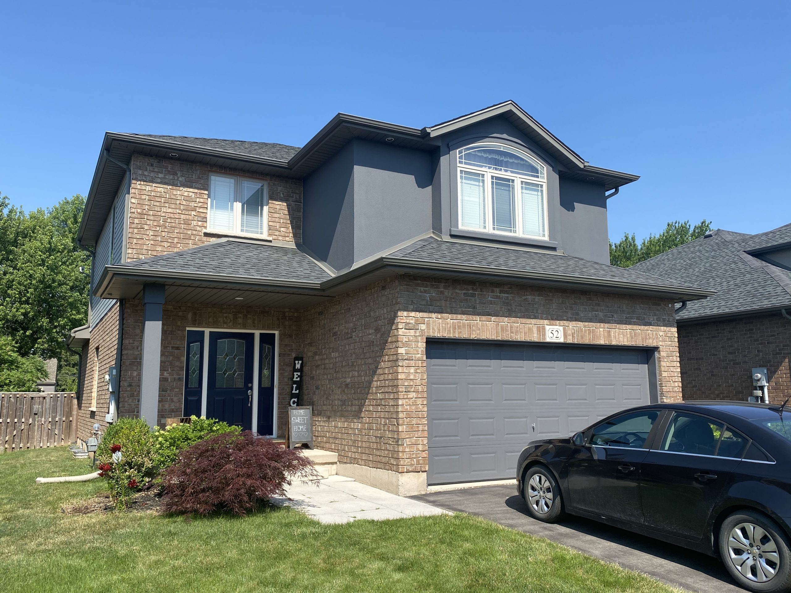 A home with an exterior color contrast completed by CertaPro Painters® of The Grand and Niagara. The door, garage, and stucco were painted to transform the curb appeal of this residence, complimenting the brick with a stark grey.