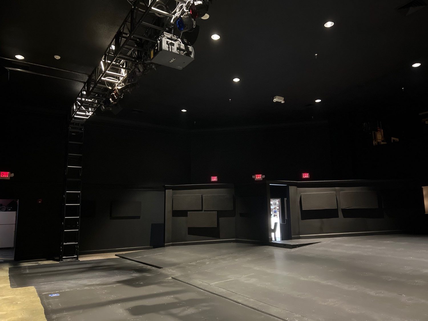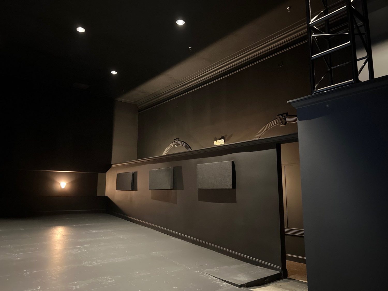 The project involved our crew doing a few different tasks, including prepping the stage area for repainting, drywall repair, adding a trim, sanding the stage, wood filling the stage, dim lighting, using a Scissor lift, Festool, and repainting the interior area for this beautifully restored black finish.